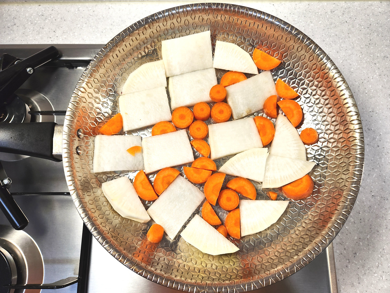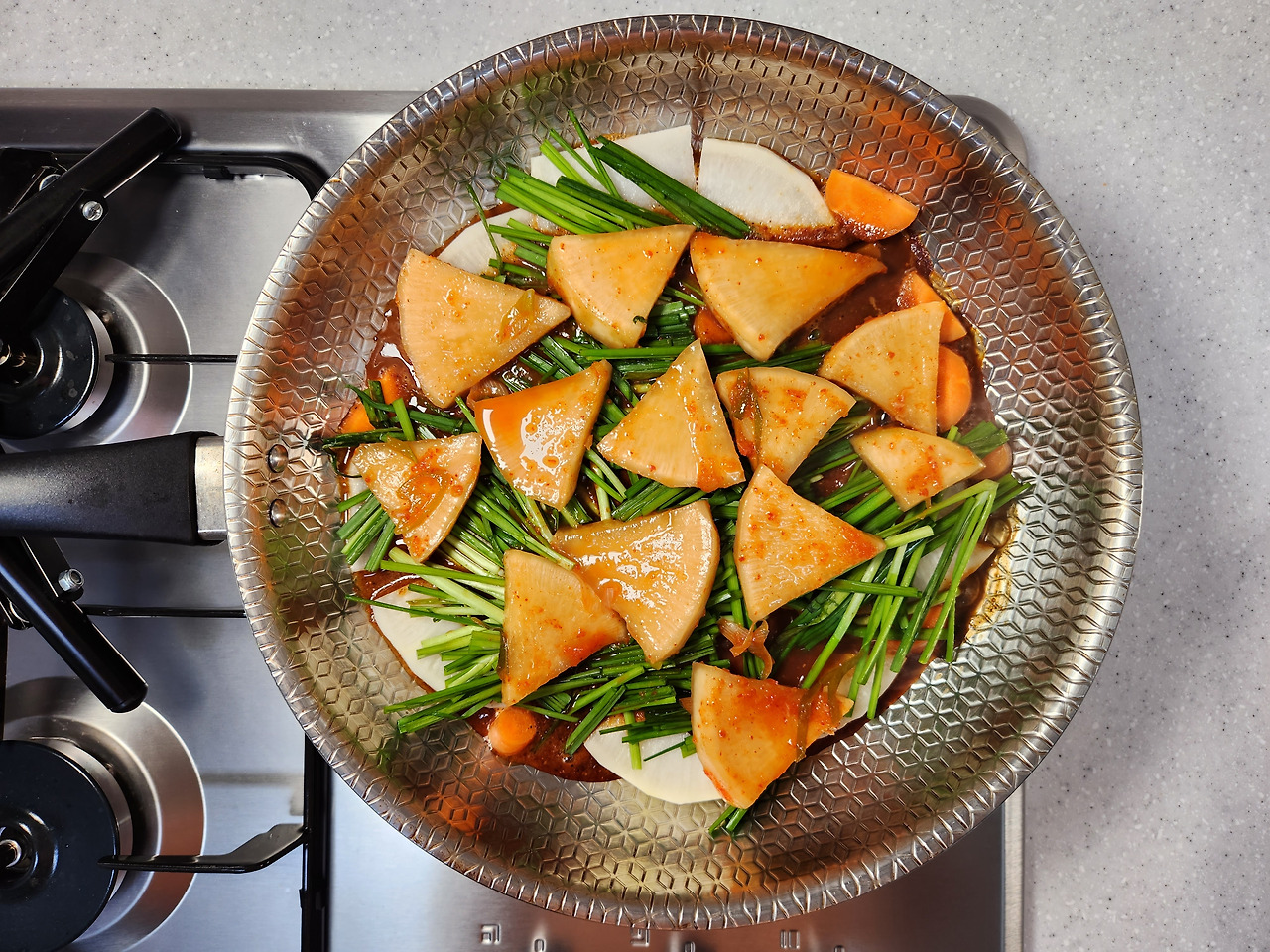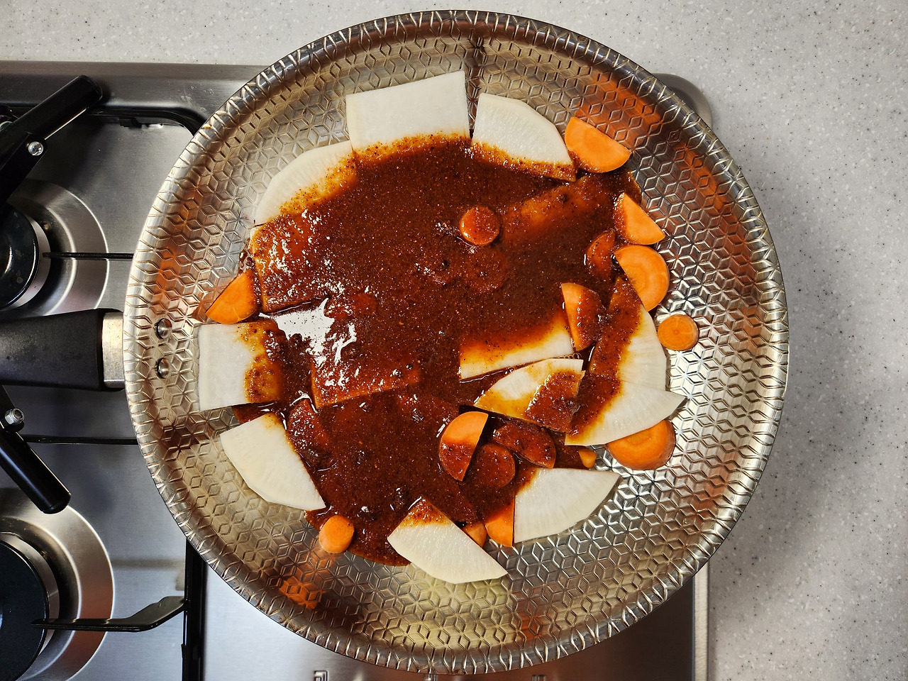 무, 당근을 1cm 두께로 도톰하게 썰어 프라이팬 바닥에 깔아주세요. 무설탕 양념장을 2/3만 넣은 다음 약불에서 10분 동안 보글보글 끓여주세요.