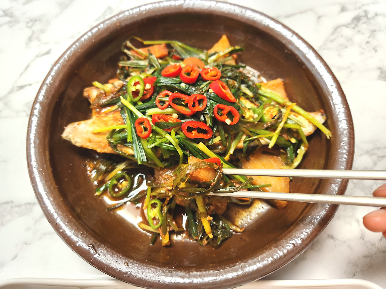 저도 1일1채식을 시작하고부턴 비린내에 더 민감해져 혼자서는 거의 고등어를 먹지 않았어요. 그런데 얼마전 친정 어머니께서 알려주신 외할머니 레시피대로 '부추고등어조림'을 해먹어 봤어요. 신기하게도 부추를 고등어 아래, 위에 켜켜히 쌓고 나니 정말 비린내가 1도 없이 사라지는 겁니다.