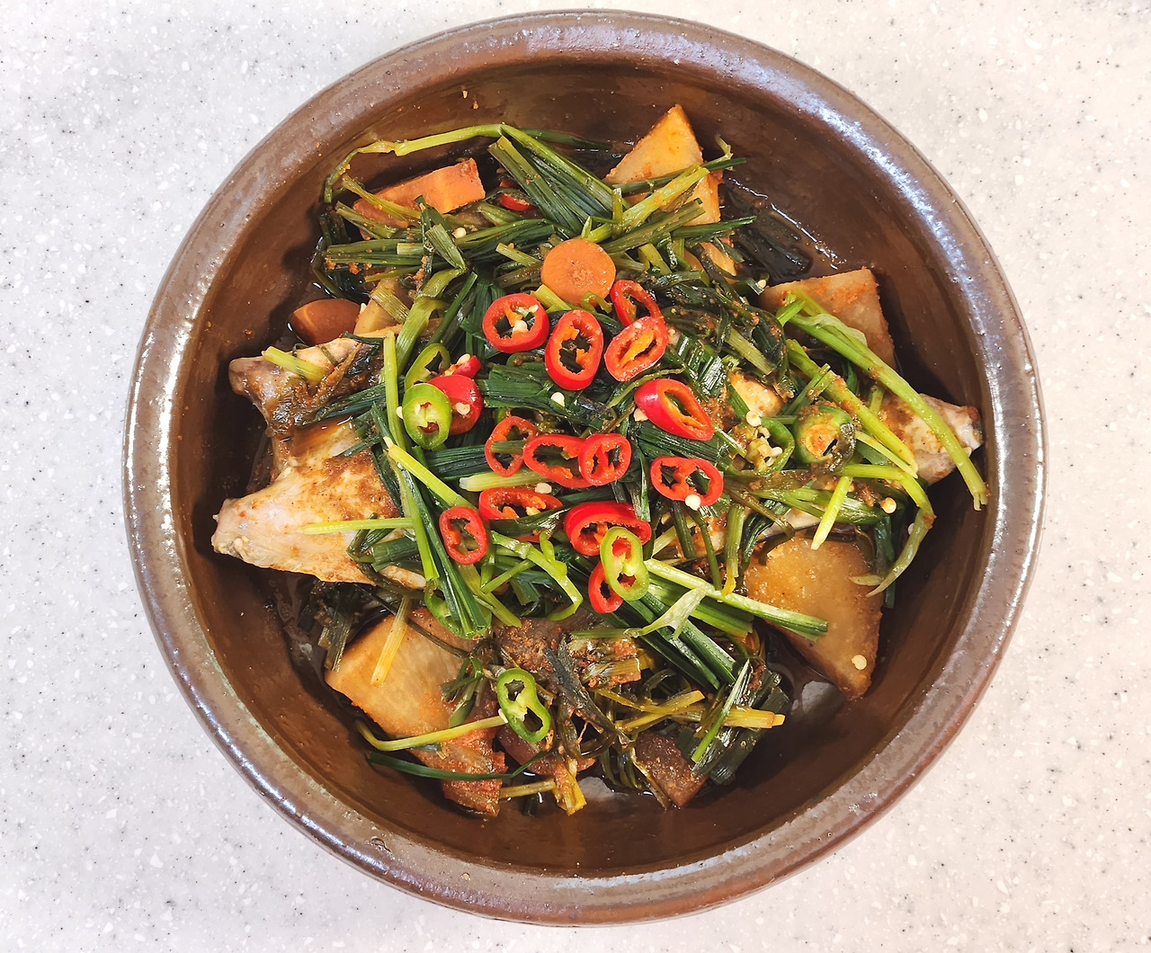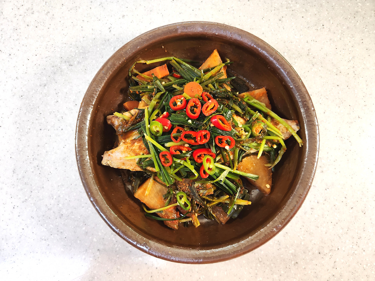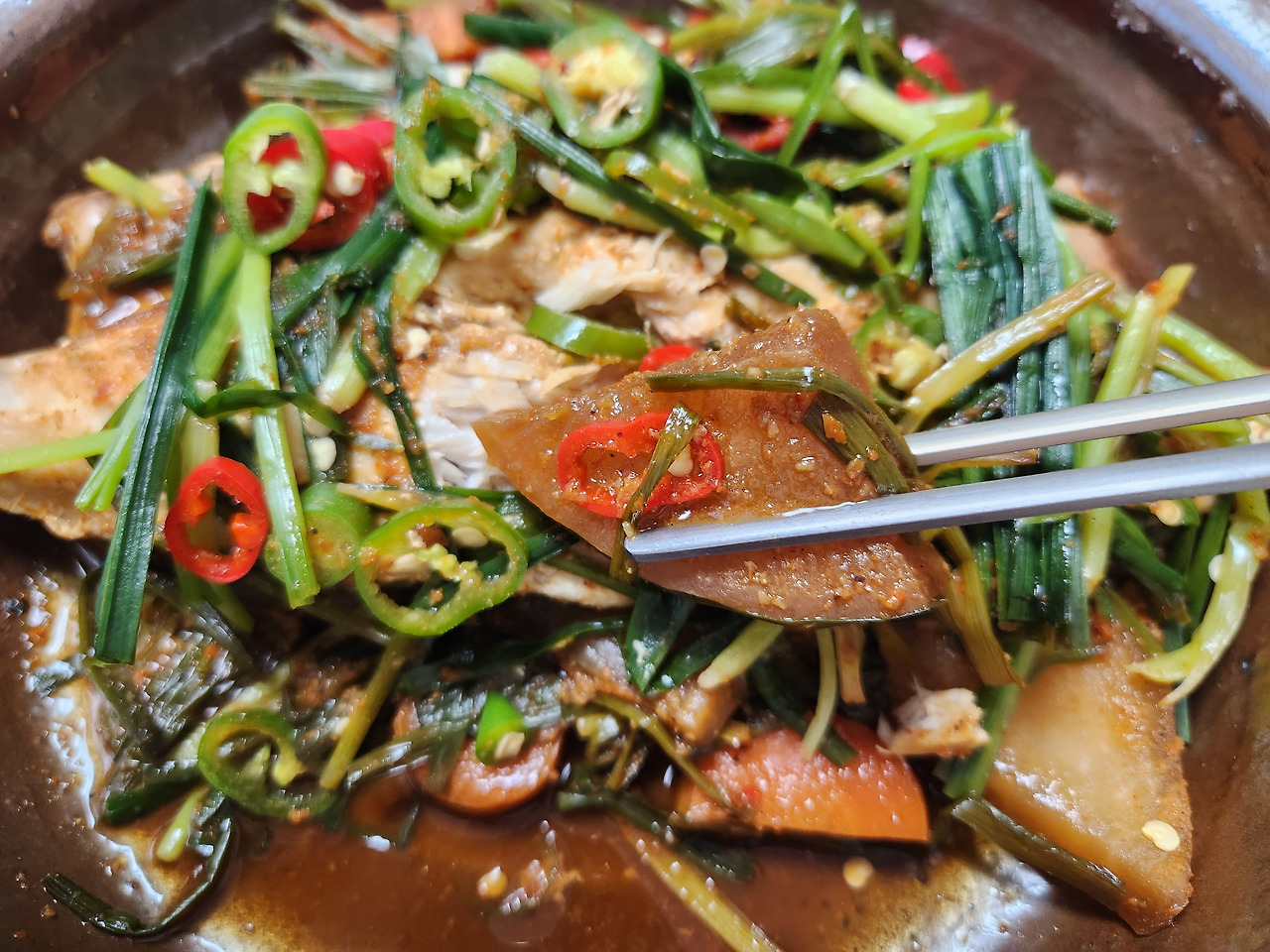불을 끈 다음 홍고추, 청양고추 1개씩 썰어 넣고 약 5분간 뜸들여주면 비린내가 더 잘 제거되요.