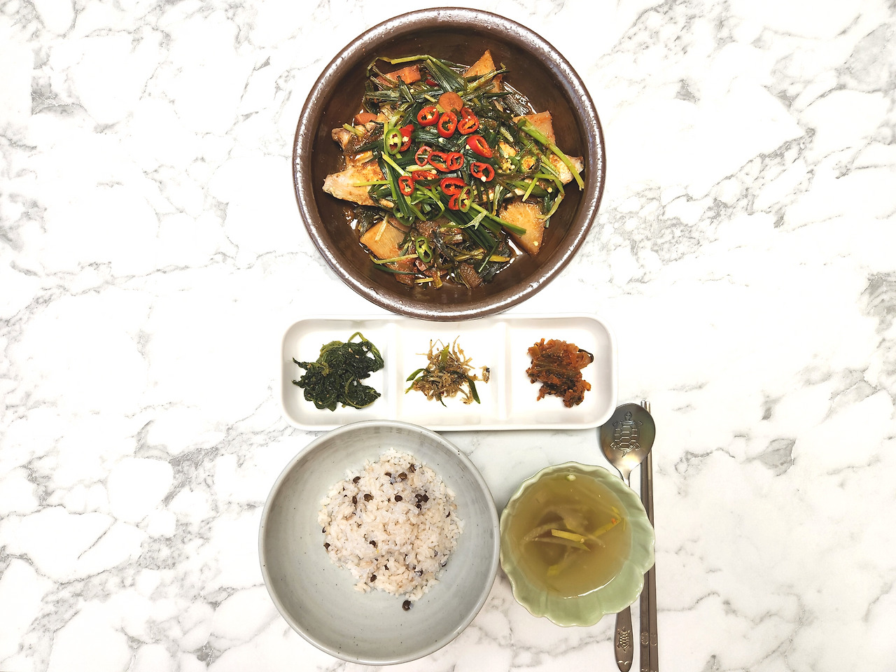 고등어조림에는 사실 많은 반찬이 필요없죠? 팥 넣은 곤약밥, 간단히 끓인 다시마뭇국, 시금치, 멸치볶음과 함께 올렸습니다.