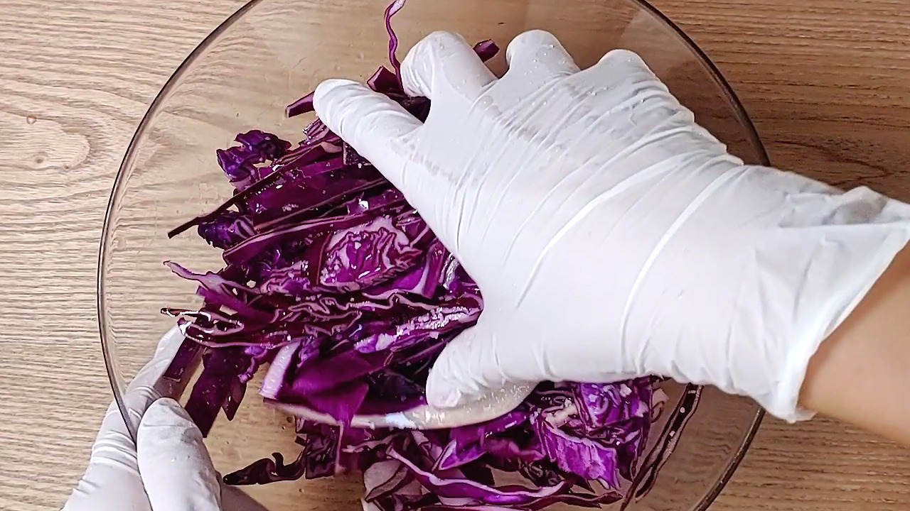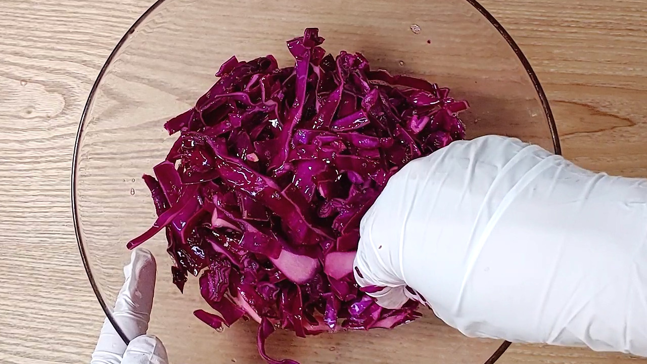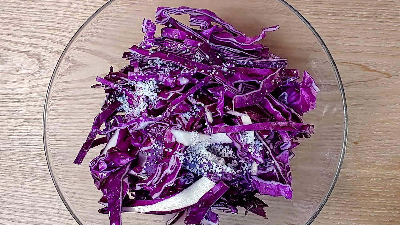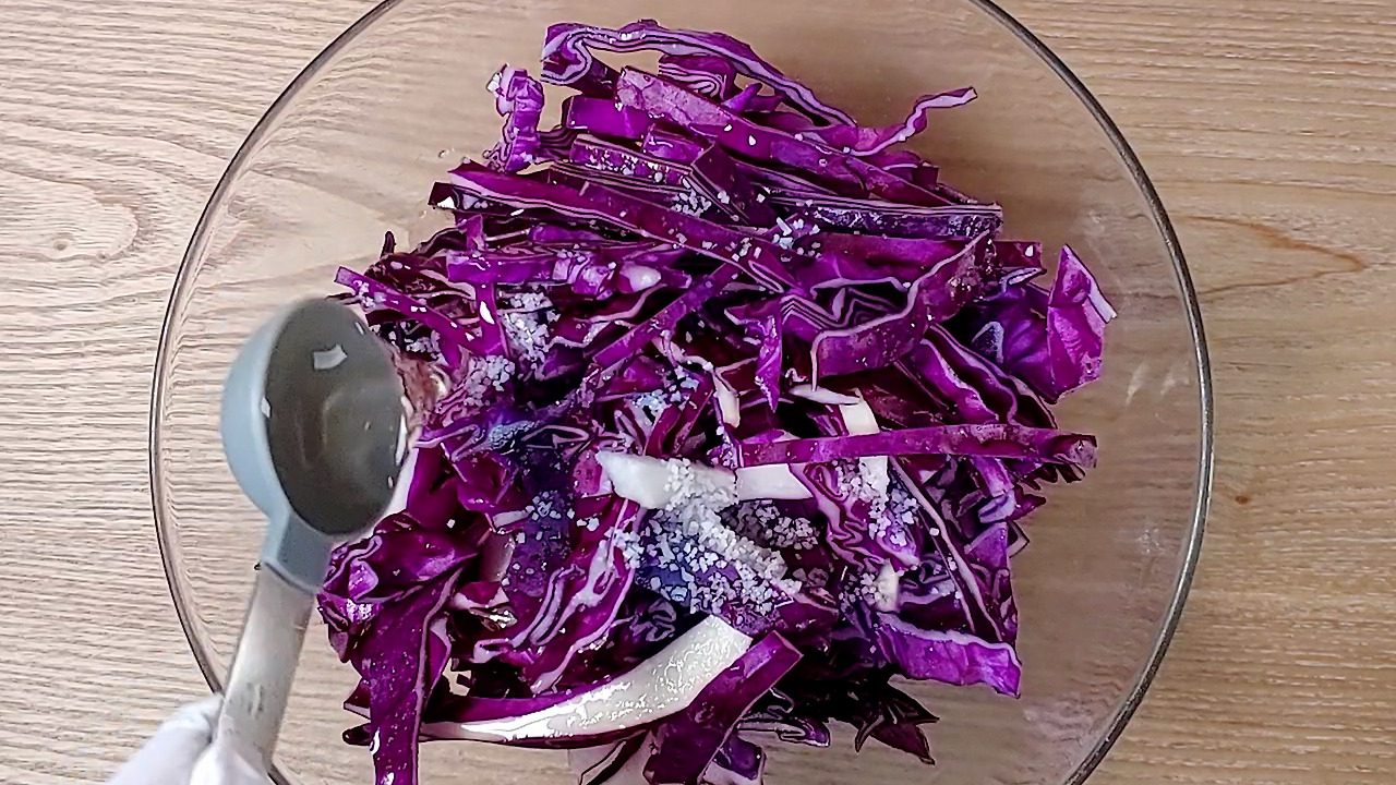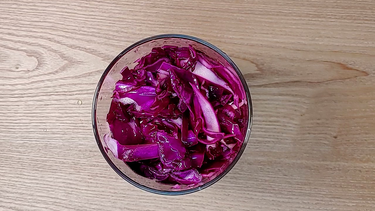 원래는 양배추 무게의 2%정도의 소금을 넣어 절이지만 소금양을 1.5%로 양을 줄여 저염으로 만들고, 여기에 식초를 넣으면 짜지 않으면서 맛있는 사워크라우트를 만들 수 있습니다. 또한 안토시아닌 색소에 식초를 넣게 되면 색이 자줏빛으로 변하면서 훨씬 더 먹음직스러워집니다. (출처: 세계음식명백과)