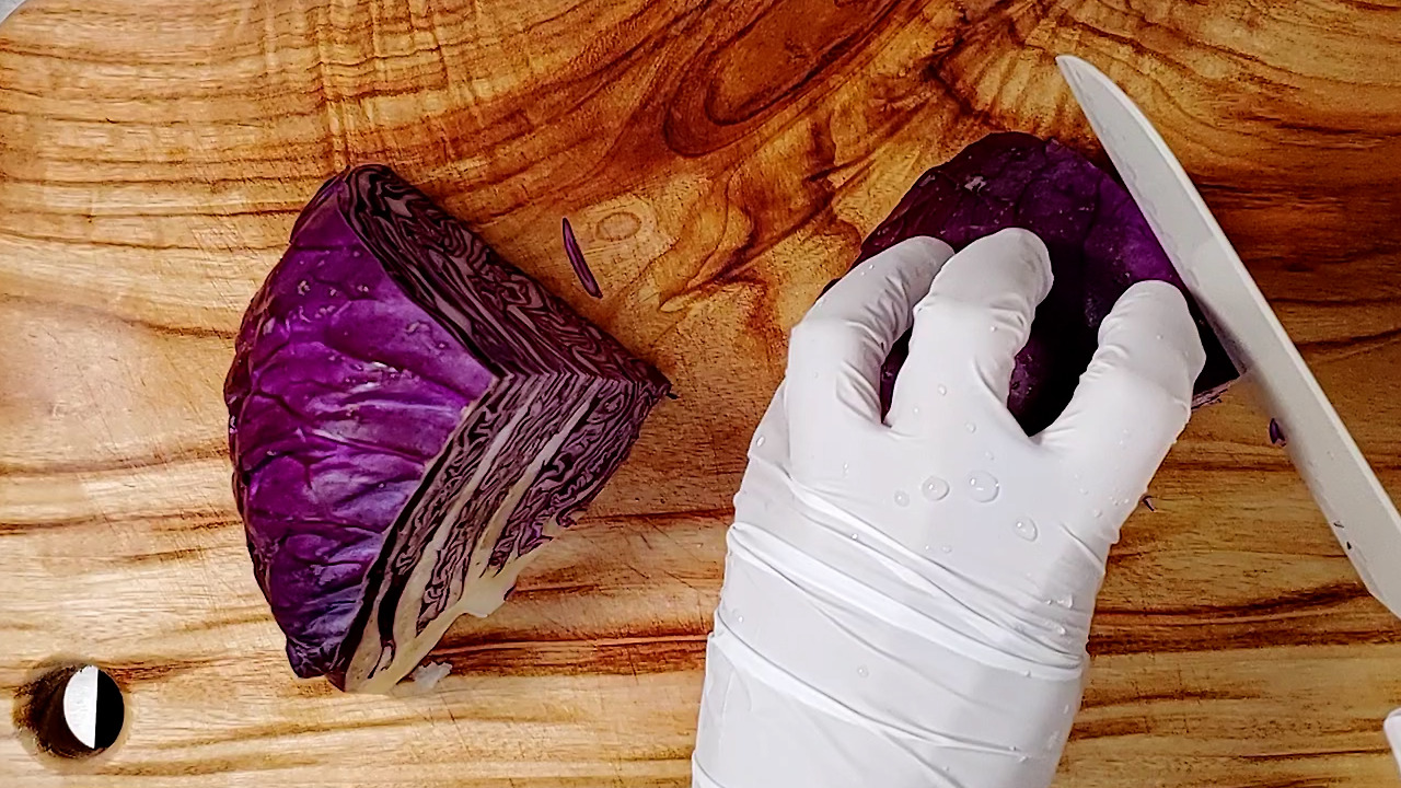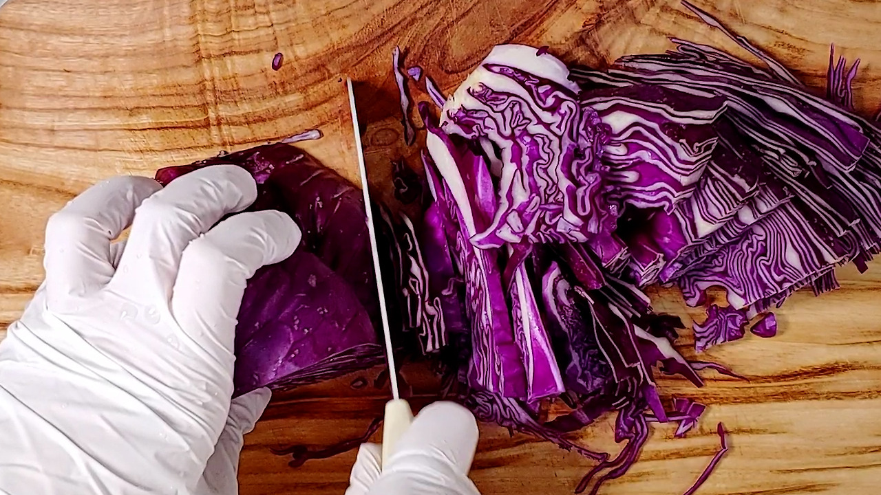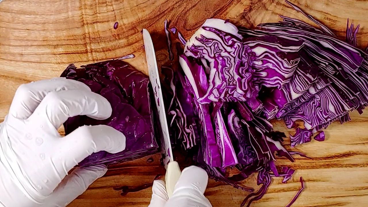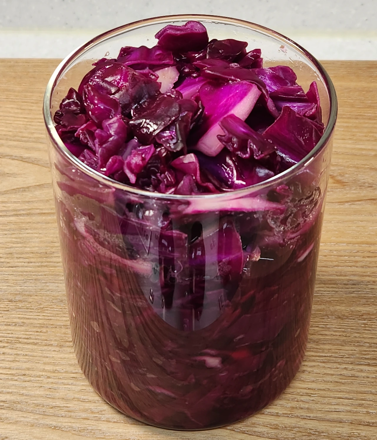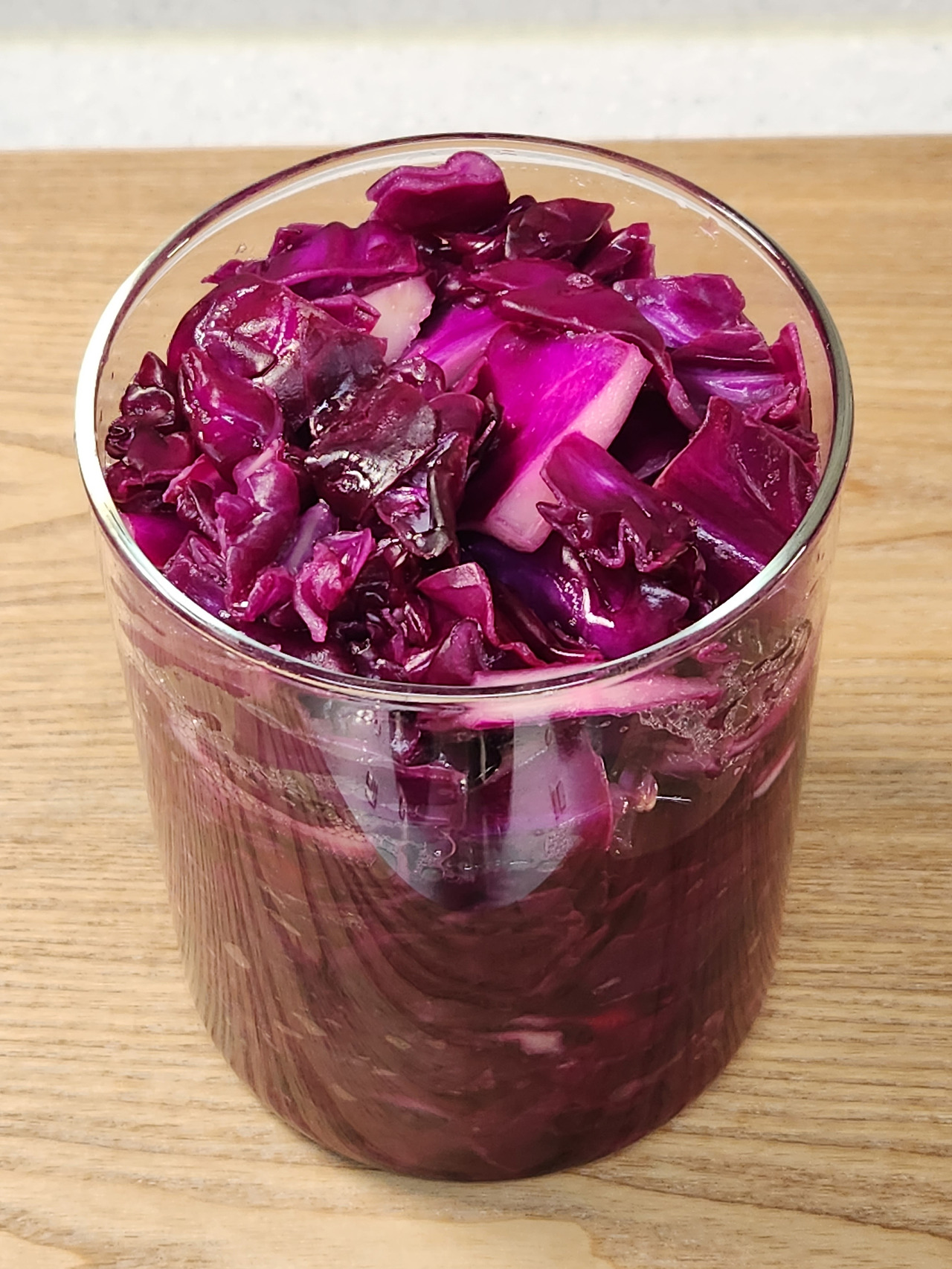 원래는 양배추 무게의 2%정도의 소금을 넣어 절이지만 소금양을 1.5%로 양을 줄여 저염으로 만들고, 여기에 식초를 넣으면 짜지 않으면서 맛있는 사워크라우트를 만들 수 있습니다. 또한 안토시아닌 색소에 식초를 넣게 되면 색이 자줏빛으로 변하면서 훨씬 더 먹음직스러워집니다. (출처: 세계음식명백과)
