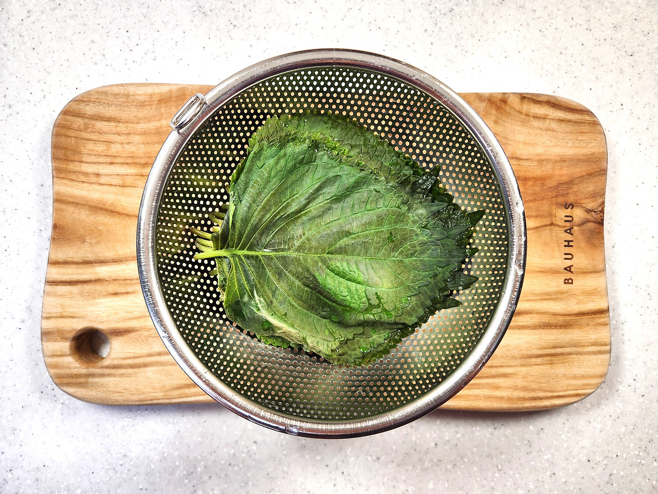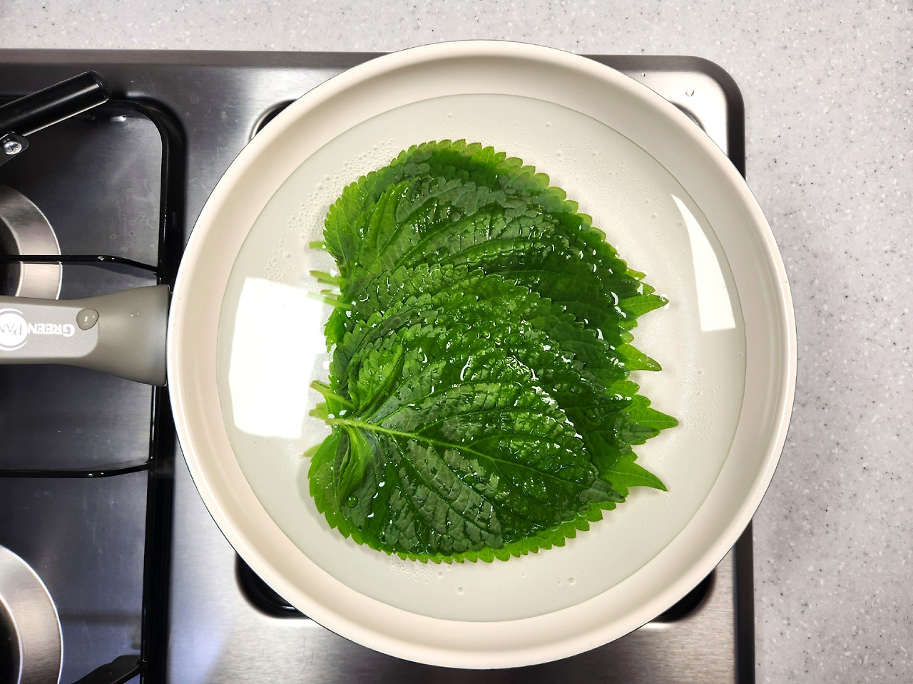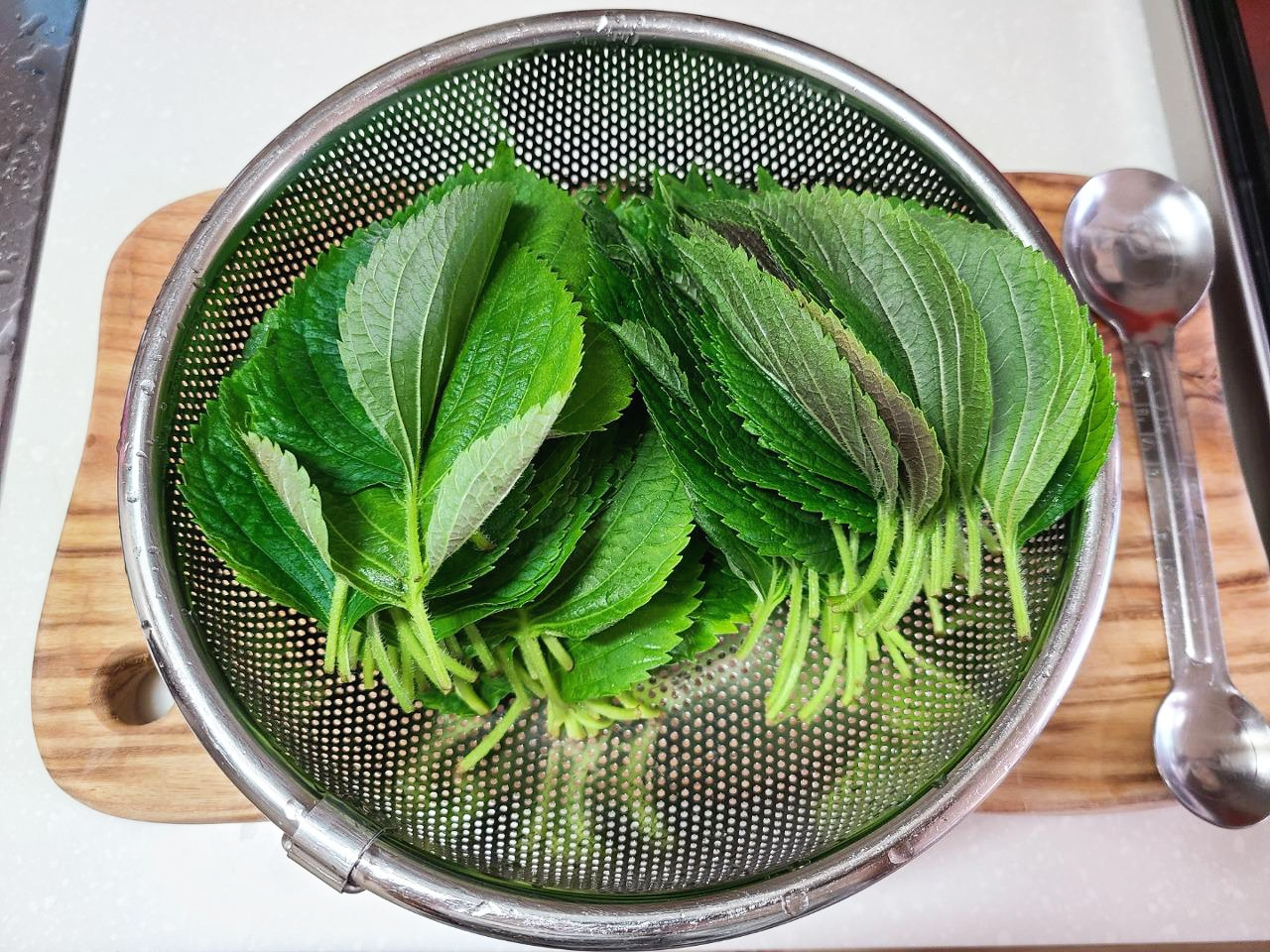 살짝 김이 오르는 물에 깻잎을 살짝 데쳐주세요.