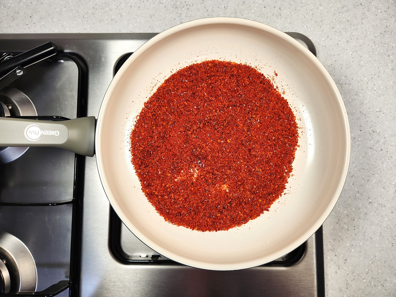 깻잎이 식는 동안 고춧가루를 기름없이 약불에서 한번 볶아주세요. 이렇게 하면 고소하면서도 매콤한 향이 살아나 단맛도 훨씬 진해진답니다.