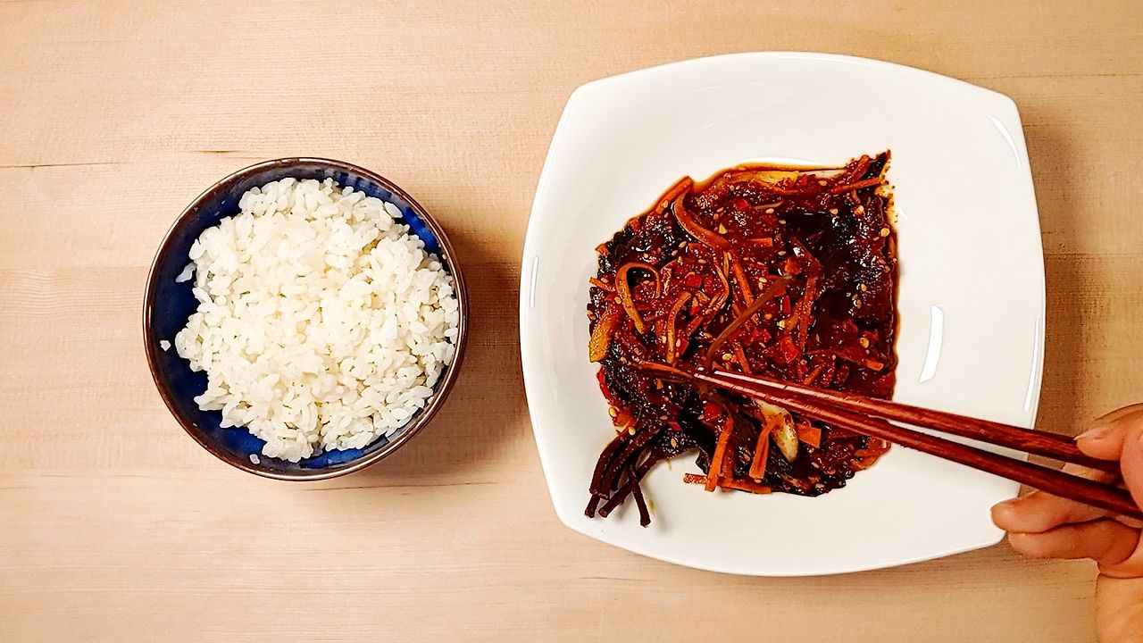 간장의 양을 줄인 대신 발사믹식초를 넣어서 새콤한 맛으로 짠맛을 보완하고 당근, 양파를 얇게 썰어 넣어 단맛이 잘 우러나게 만들었답니다. 홍고추의 매콤한 맛과 한번 기름없이 볶아낸 고추가루의 향으로 깊어진 풍미를 느낄 수 있어요.