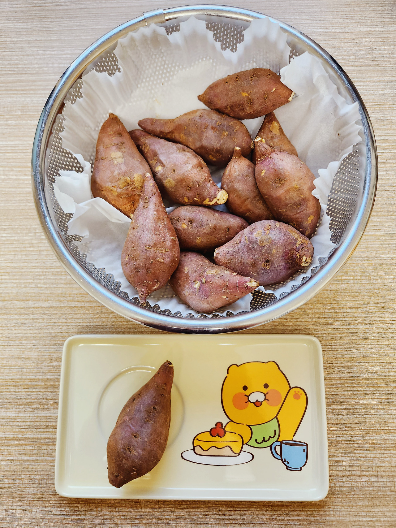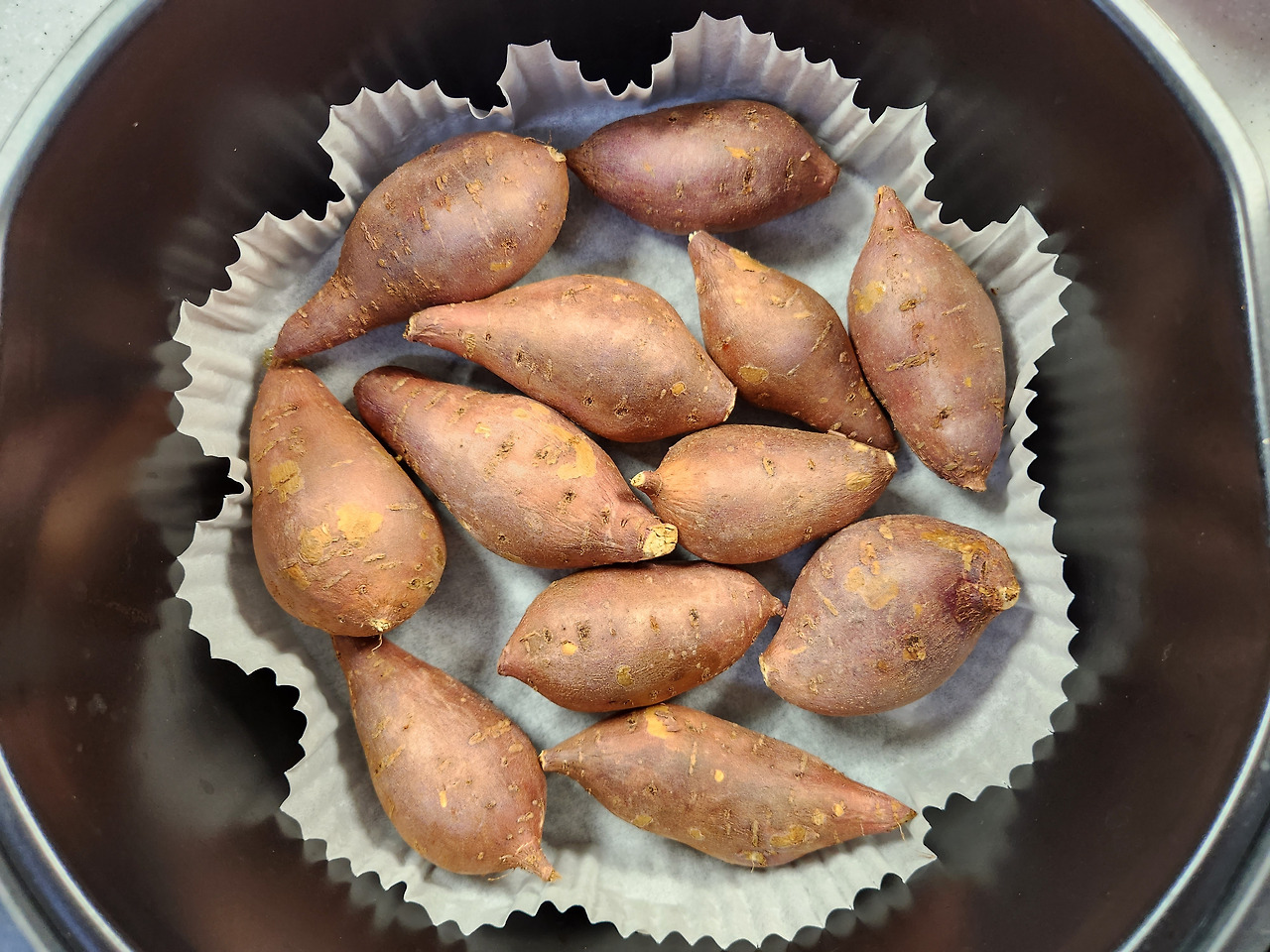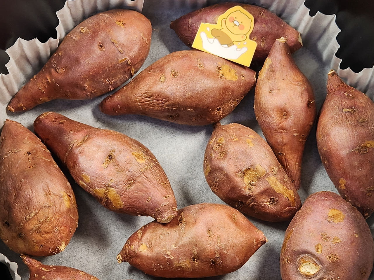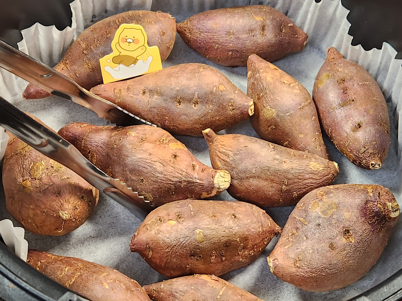 고구마를 깨끗이 씻어서 에어프라이어에 넣어주세요. 고구마가 잘 익을 수 있도록 겹치지 않게 놓아줍니다.