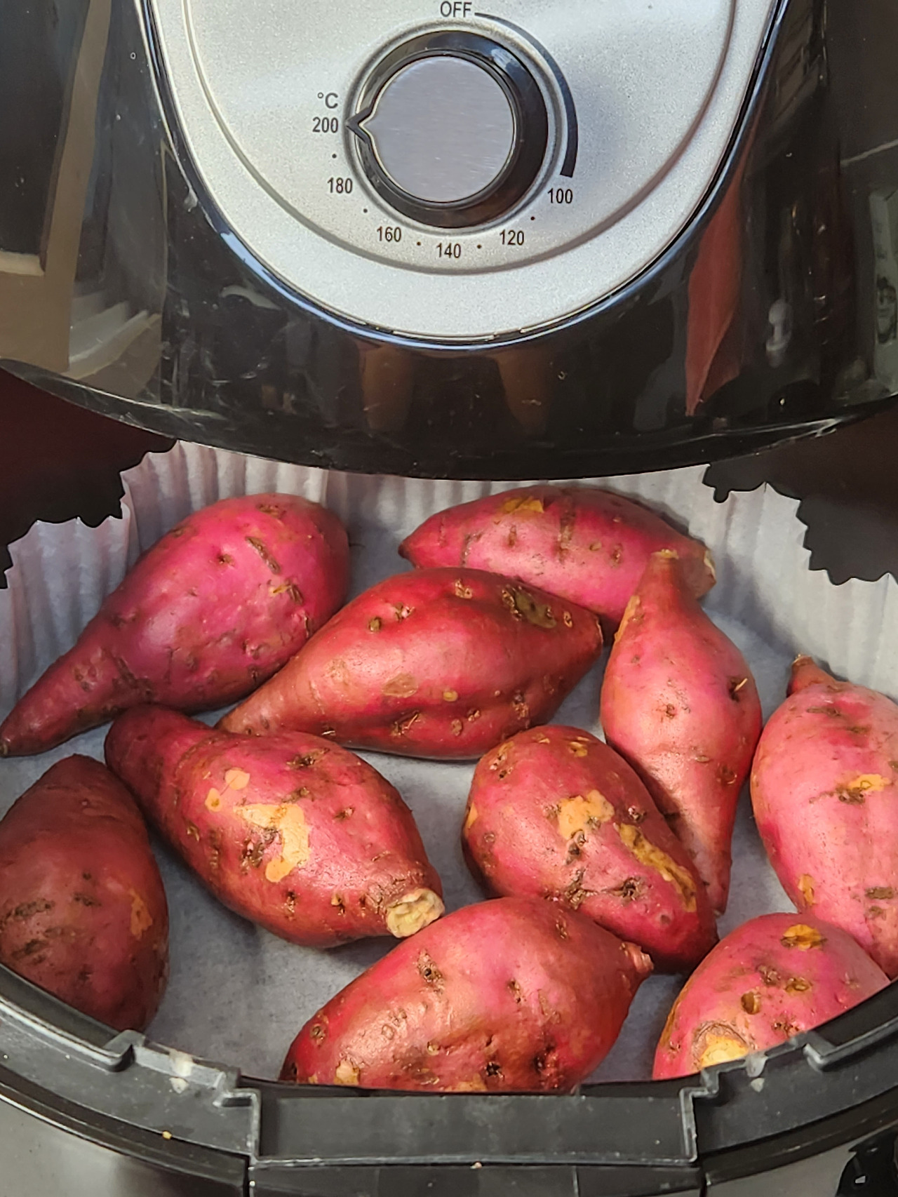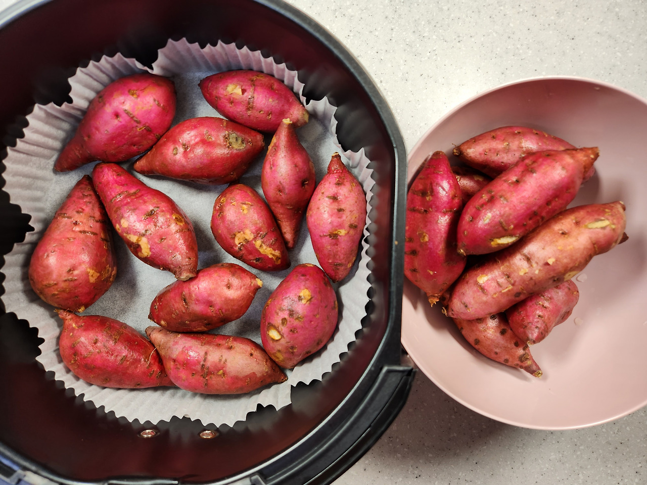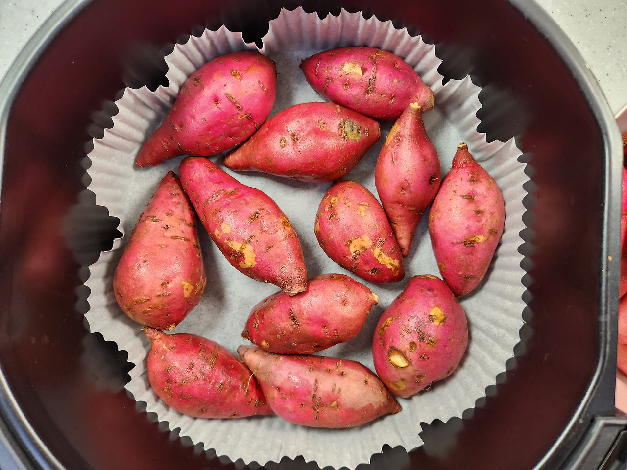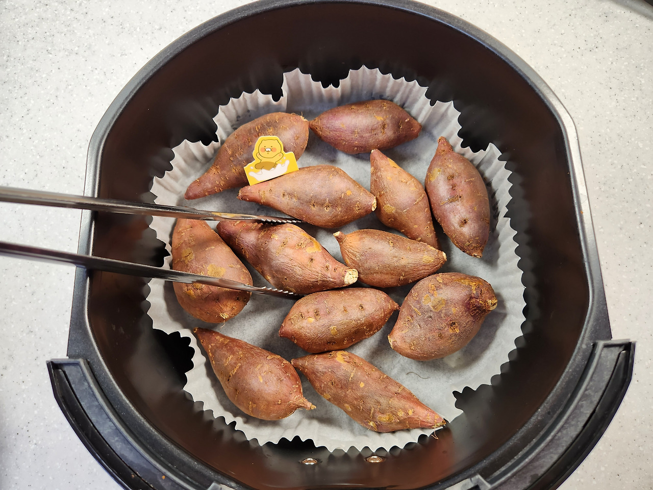 고구마를 깨끗이 씻어서 에어프라이어에 넣어주세요. 고구마가 잘 익을 수 있도록 겹치지 않게 놓아줍니다.
