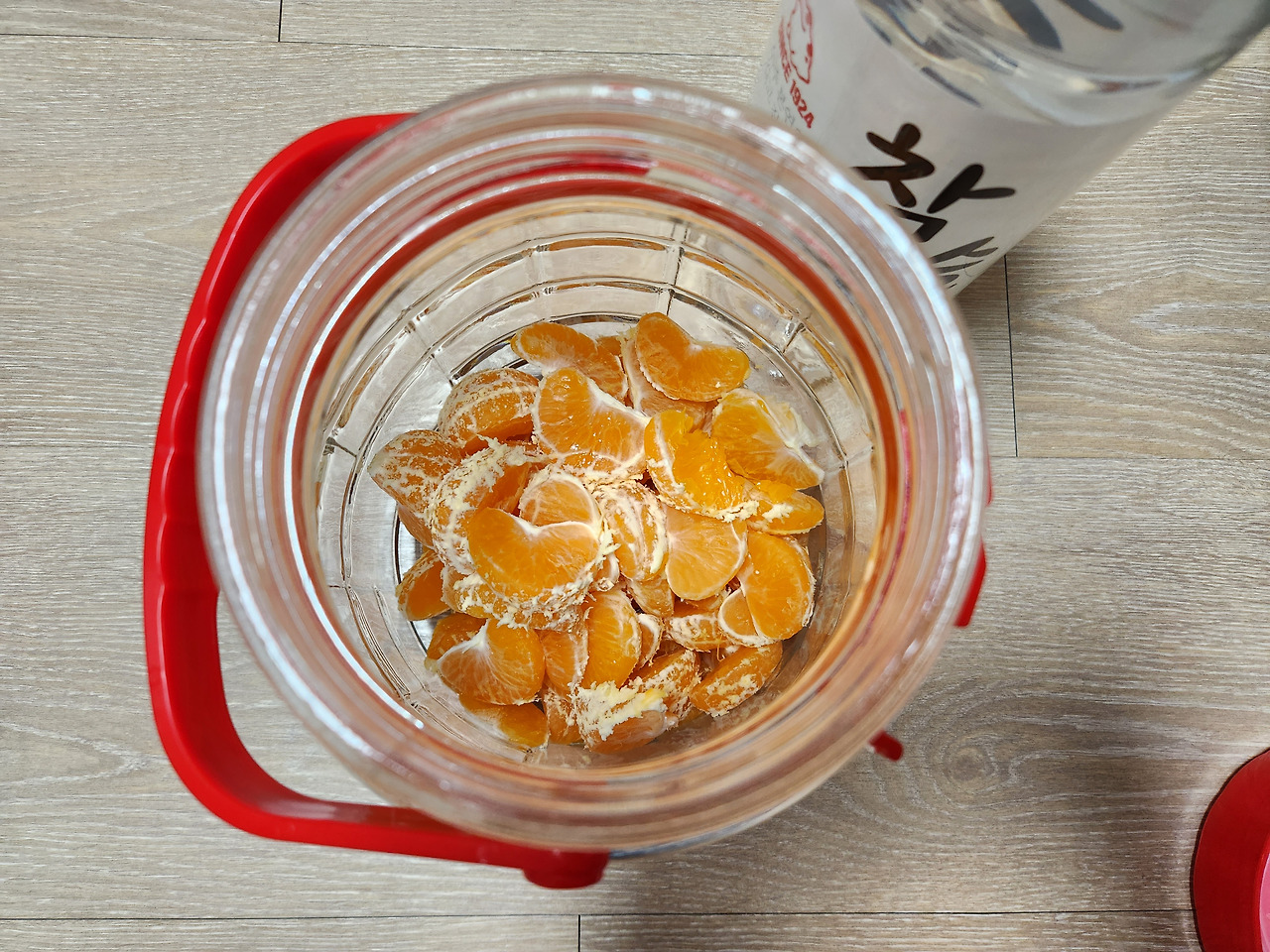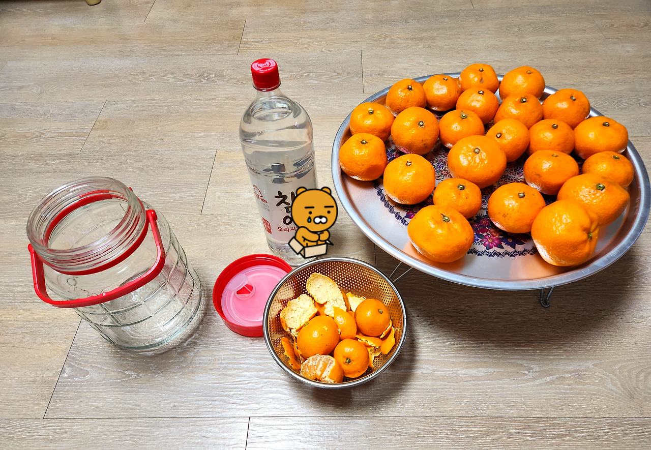 하지만 저 귤 한박스를 고스란히 버릴 수는 없었다. 우리 먹으라고 주신 귤인데 시부모님 마음을 생각하면 그대로 버릴 수는 없었다. 터진 귤은 골라내고 왠만하면 곰팡이 핀 곳에서 멀리 떨어진 귤만 추스려서 물로 한번 씻어내고 껍질을 벗겨 술로 담궜다.