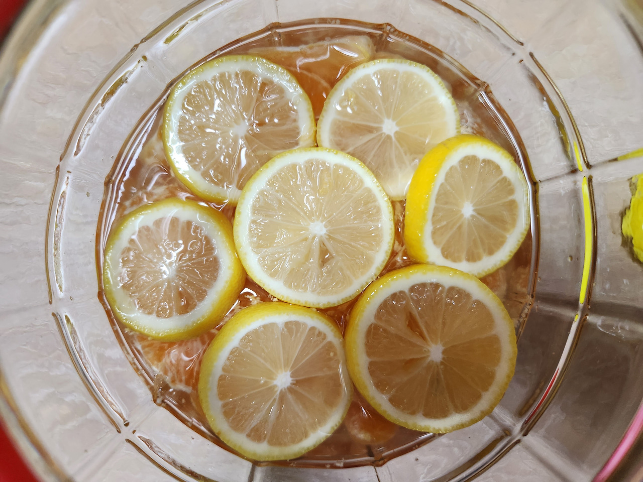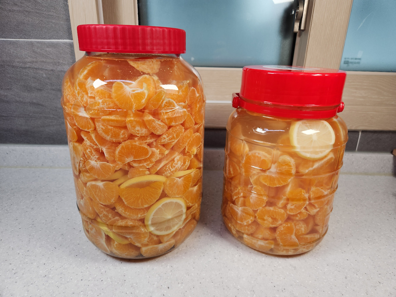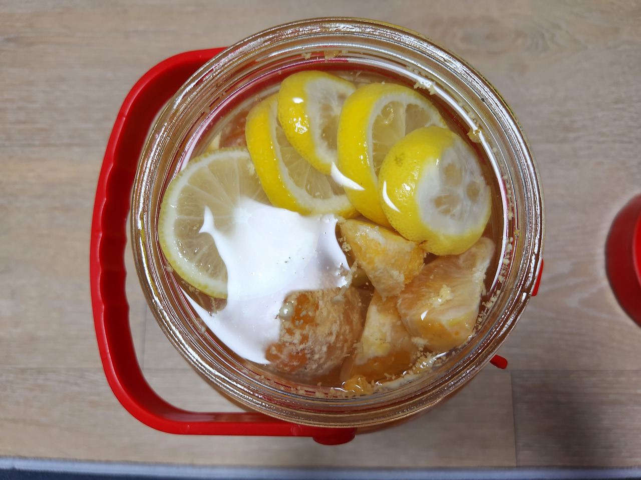 無설탕 귤주 (어머님 맛보시라고 설탕 대신 중간과 맨 위에 레몬을 넣어 부패를 방지했다.)