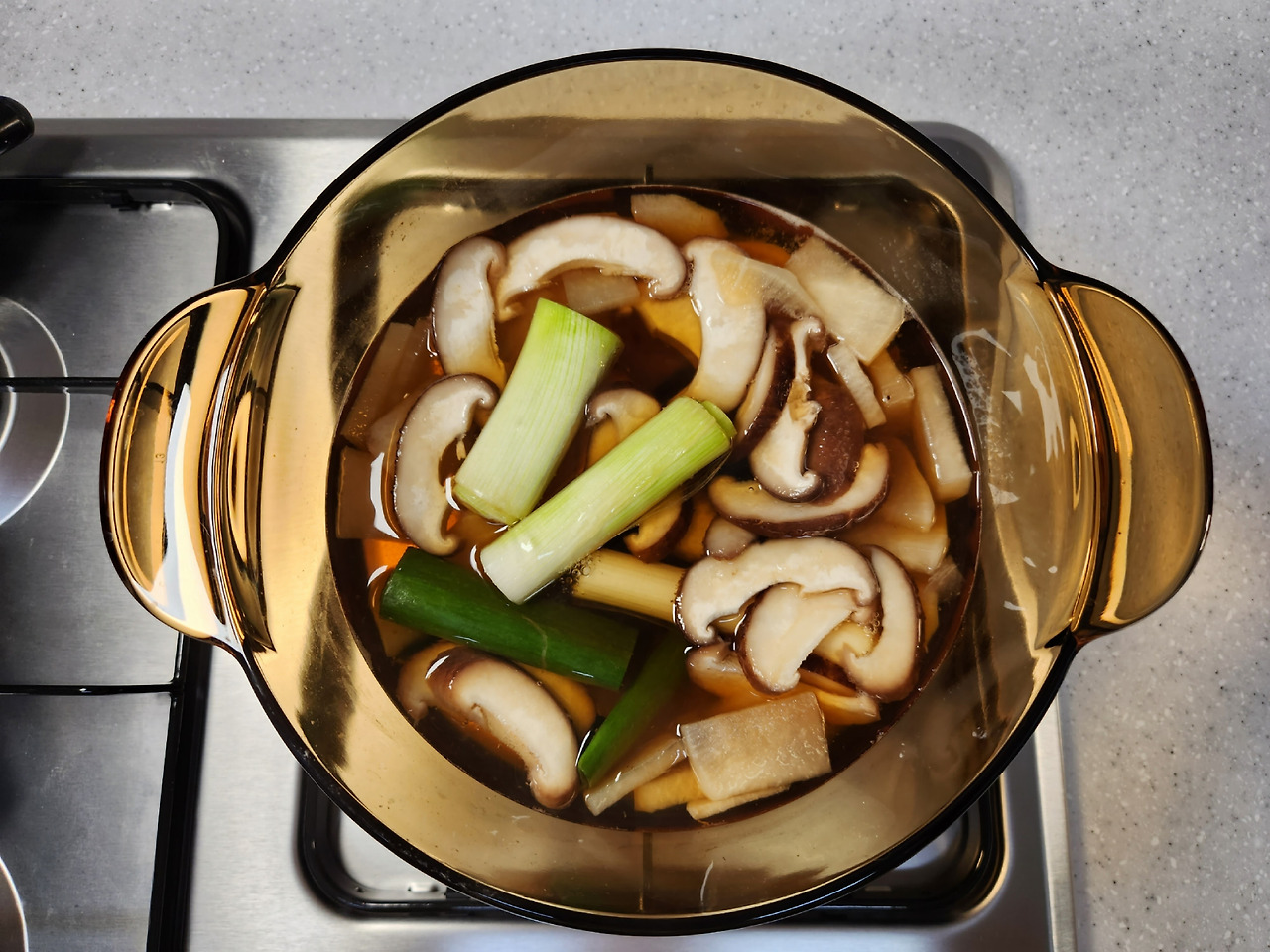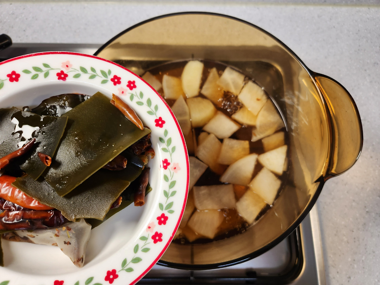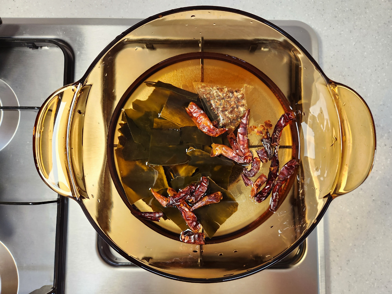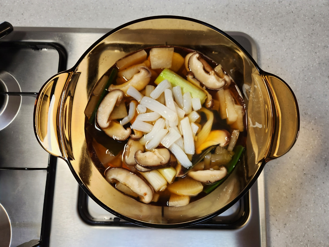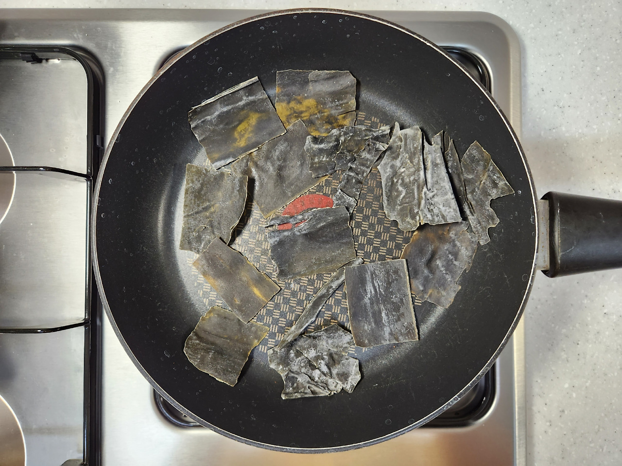 건다시마도 약불에서 한번 구워내면 맛있는 국물을 우릴 수 있습니다. 동물성 재료 없이 비건으로 국물을 우릴 때는 여러가지 다양한 방법을 사용하는 게 좋습니다.