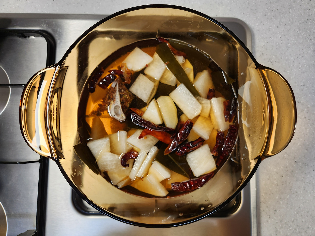 채소수 티백에 무, 건다시마, 베트남 고추 구운 것을 넣고 물 750ml를 넣은 다음 강불에서 5분 간 끓여줍니다.