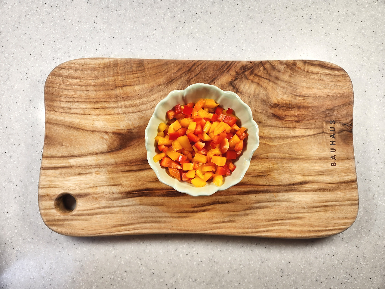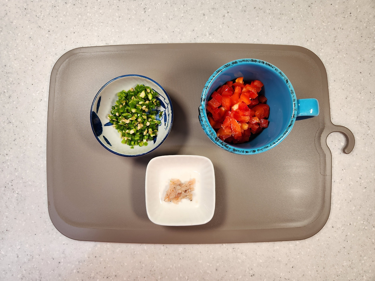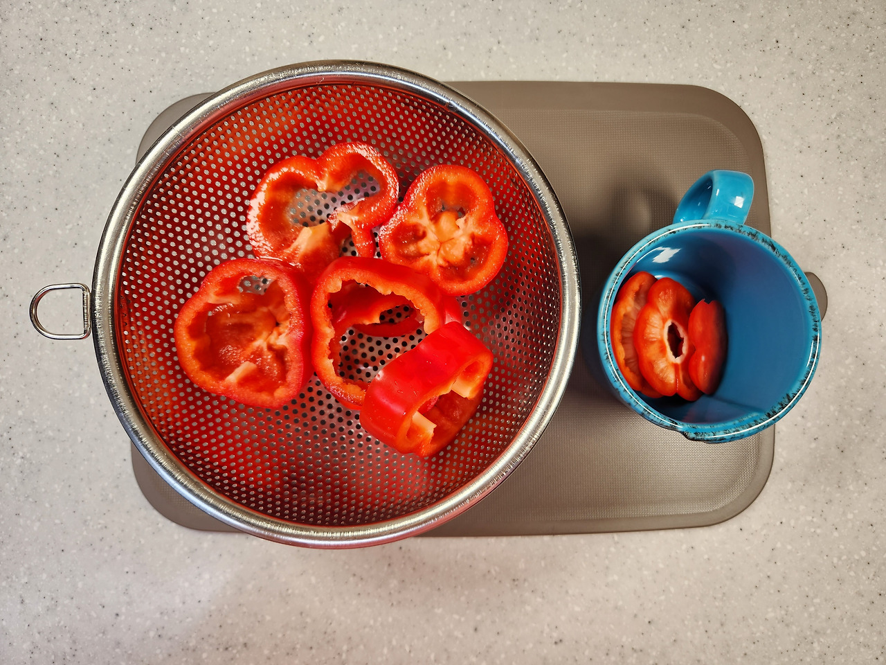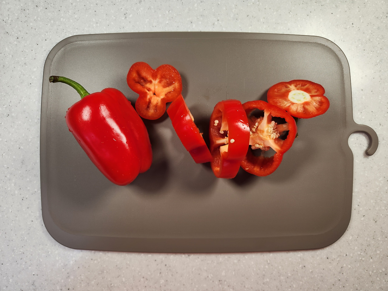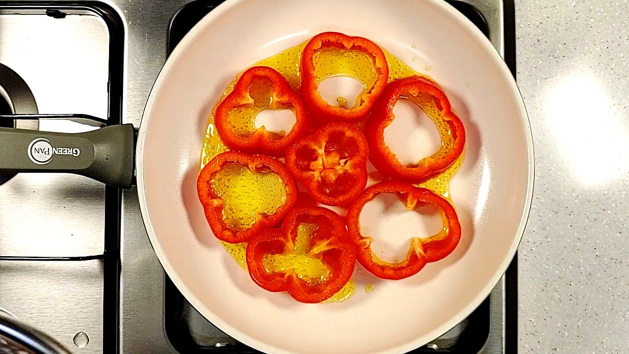 파프리카 2개는 1cm 두께로 도톰하게 썰어 주세요. 심지와 씨는 흐르는물에 제거합니다. 꼭지와 꼬투리 부분은 다져서 넣을 거라 따로 준비해주세요.