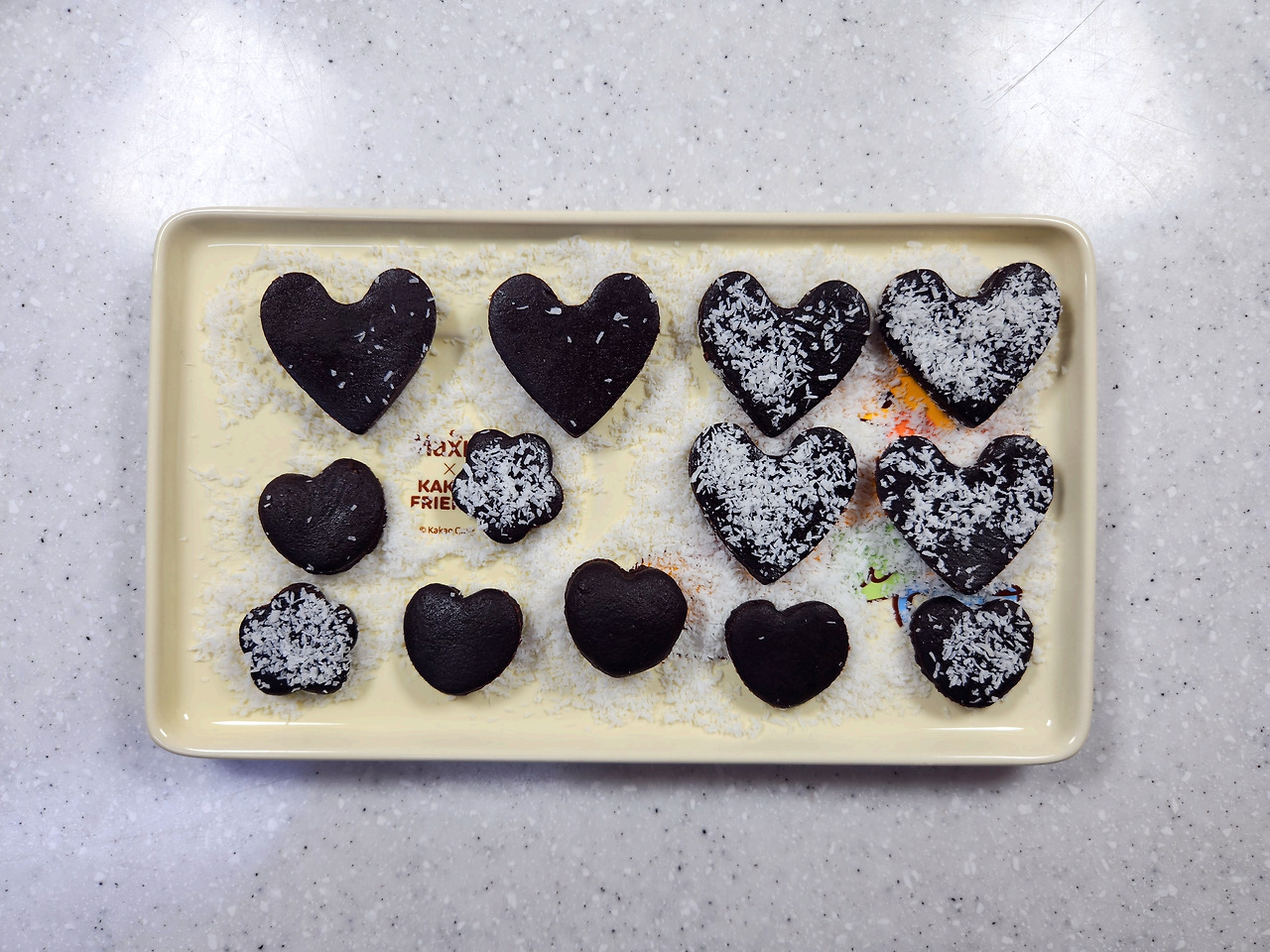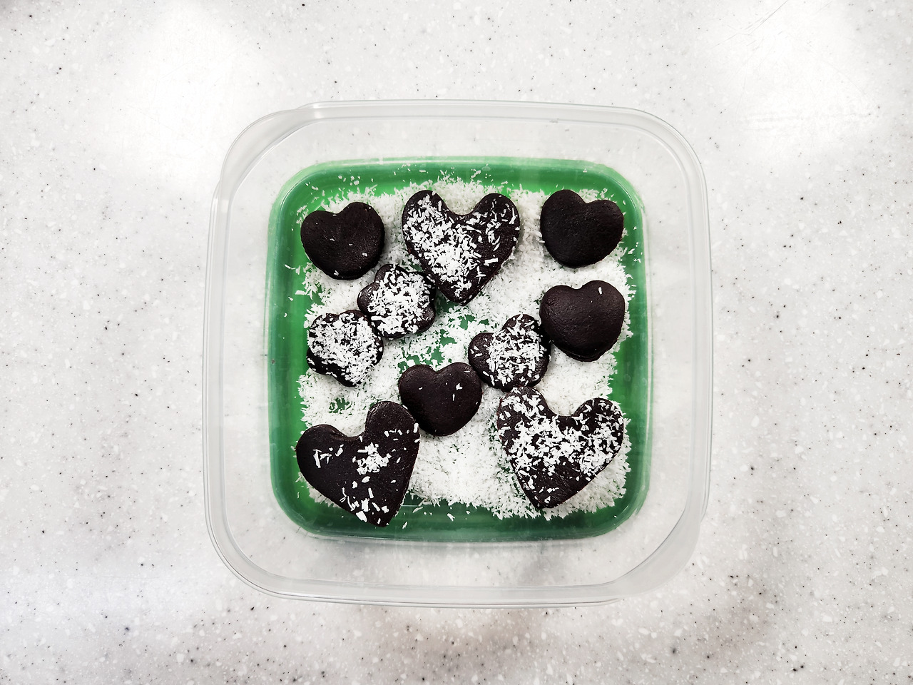 저는 보관통에 코코넛가루를 뿌려서 초콜릿이 달라 붙지 않게 한 다음 냉동실에 30분 동안 굳혀서 조금 딱딱하게 먹었어요. 이럴 땐 초콜릿들이 서로 붙지 않도록 사이사이 코코넛가루나 코코아파우더 뿌려주시면 좋아요.