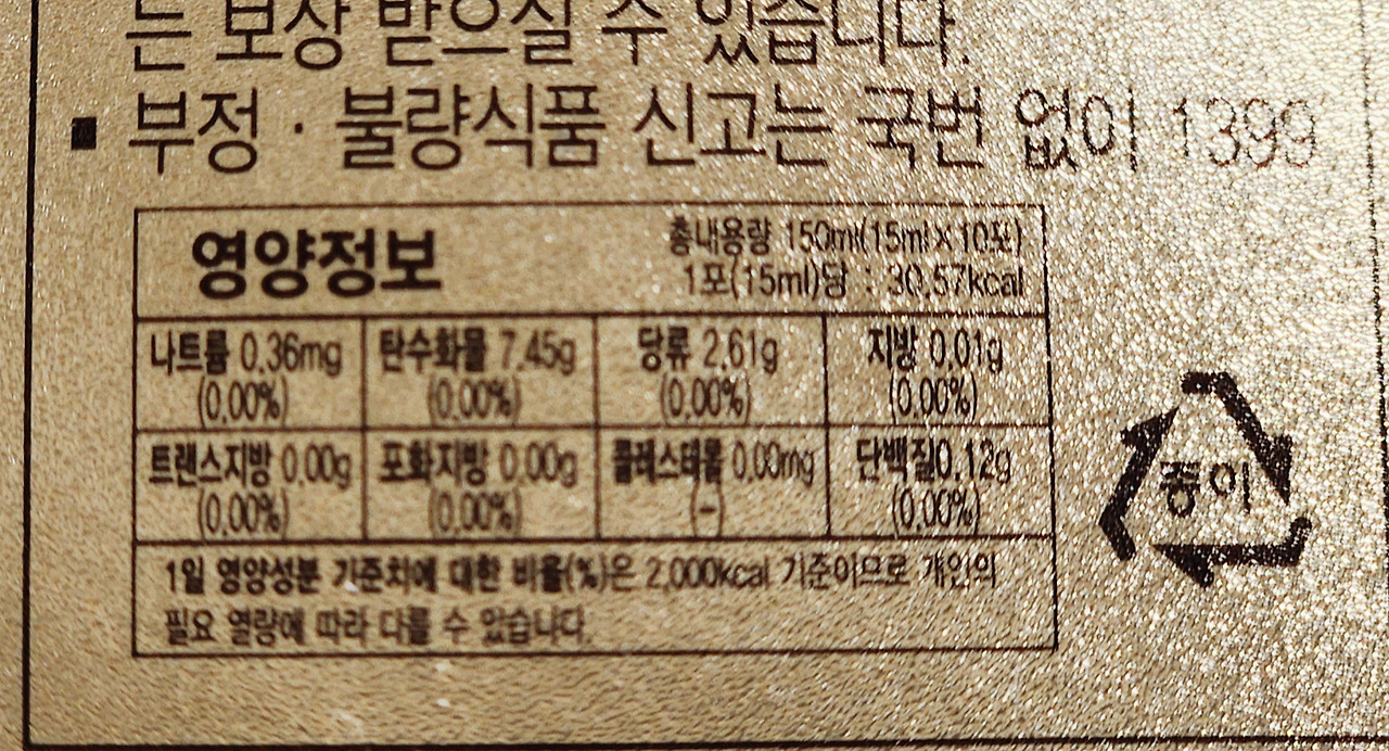 아무튼 우리나라 식품법 참 요상하다. 1포에 30.57칼로리라면 어쨌든 칼로리는 있는 것이고 어머님께 잘 설명 들여서 기준량(1일 2회, 1포씩)에 맞게 가끔씩 드시라고 조언했다. 원료, 성분 표시나 영양성분 표시가 너무 작게 써있어서 나 같은 젊은(?) 사람도 확인하기 어려운데 어르신들은 오죽하실까?