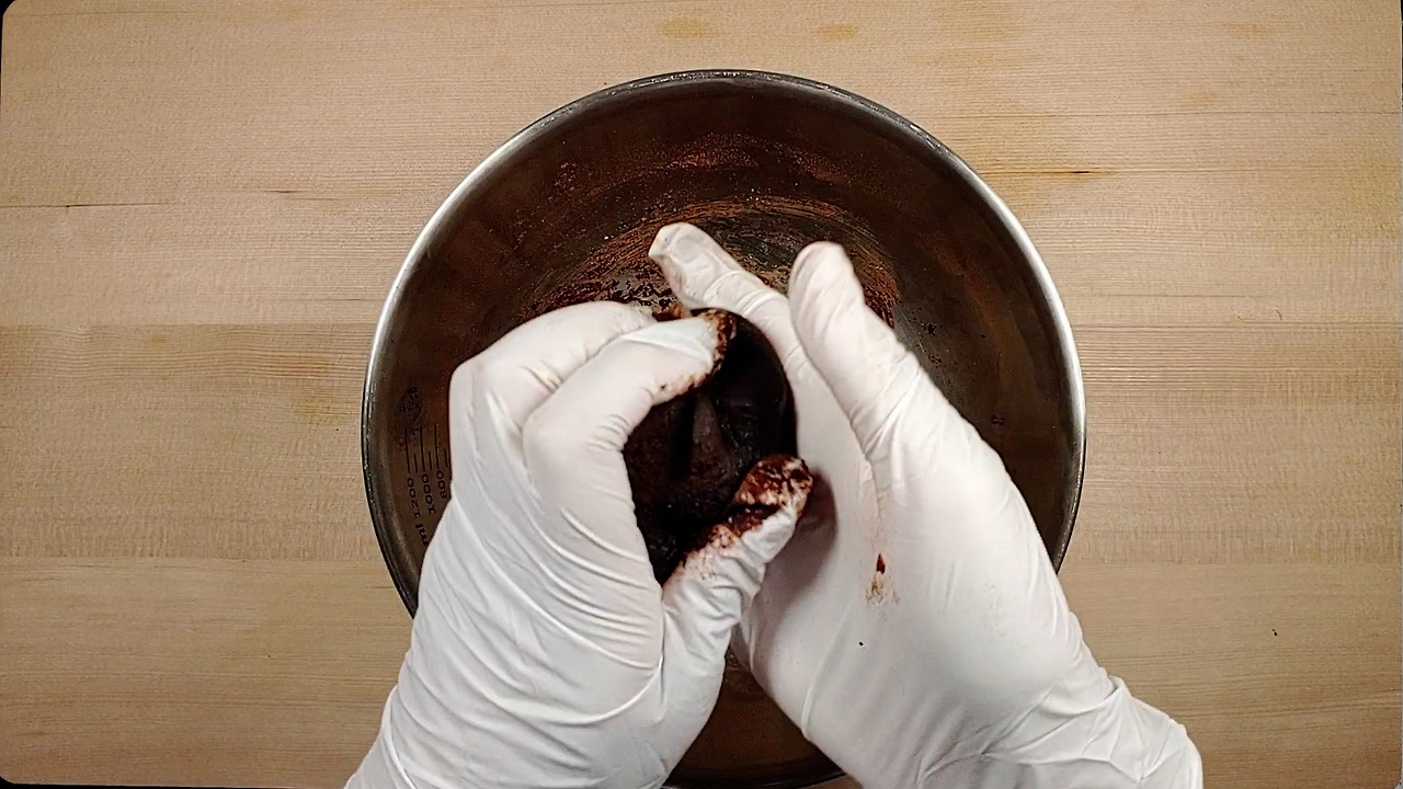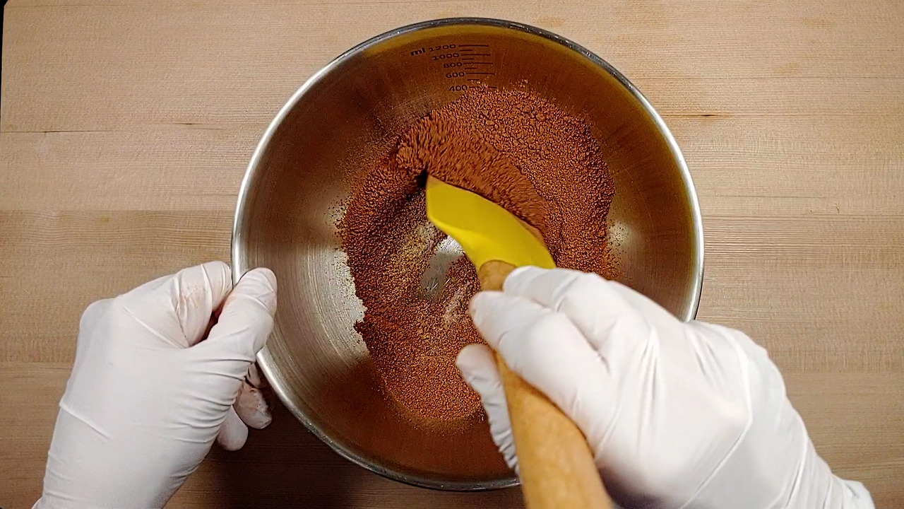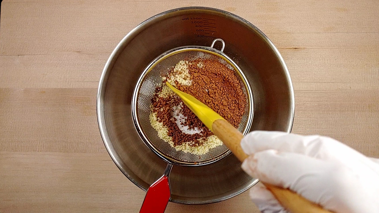 코코아파우더, 아몬드 가루, 가루 알룰로스를 체에 넣고 잘 섞으며 걸러줍니다. 마지막에 걸러져 나온 것도 한번 잘 섞어주세요.
