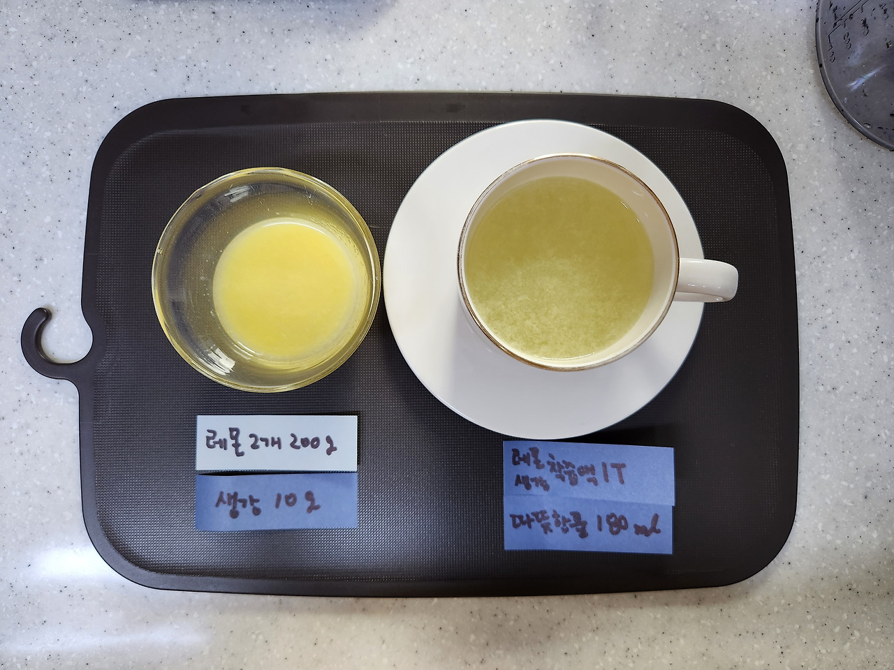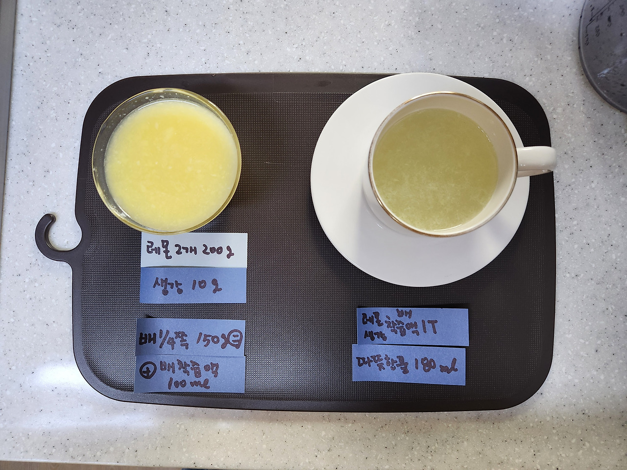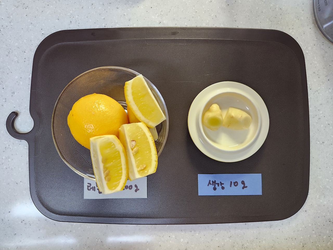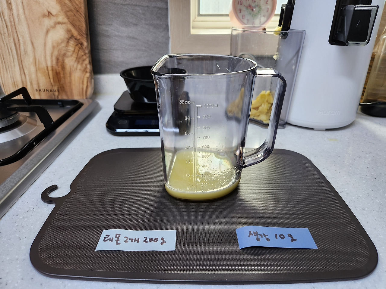 최종레시피: 레몬 2개 (200g) + 생강 10g + 배 150g