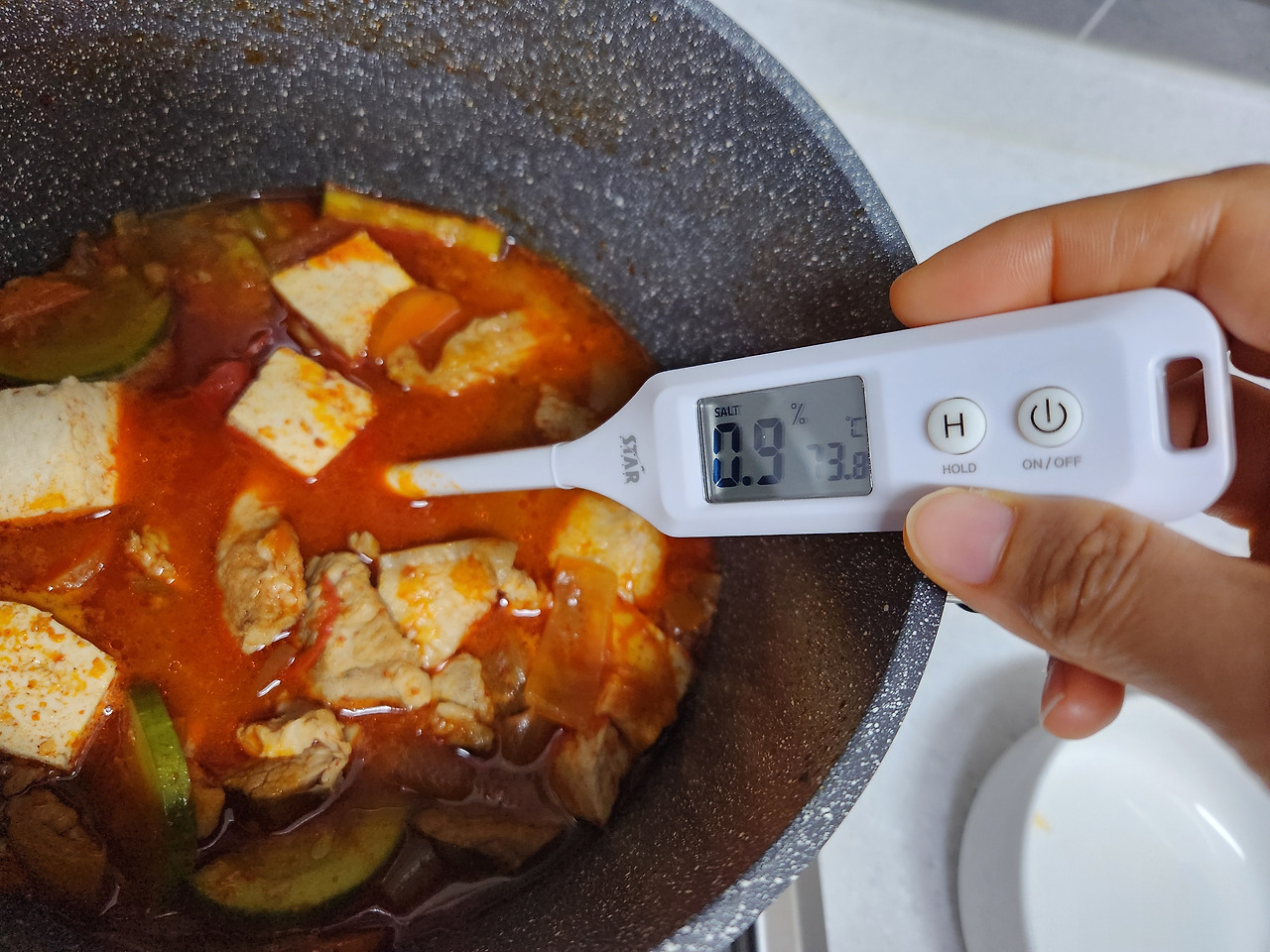 *염도계를 쓰실 땐 국물을 따로 덜어 상온으로 식힌 다음 측정하는 게 올바른 방법입니다. 조리하자마자 냄비에 푹 집어 넣은 건 구독자분들께 직관적으로 보여드리기 위함입니다.