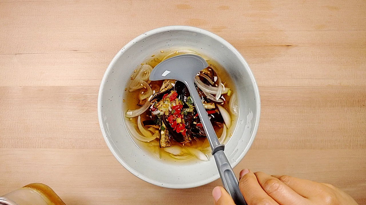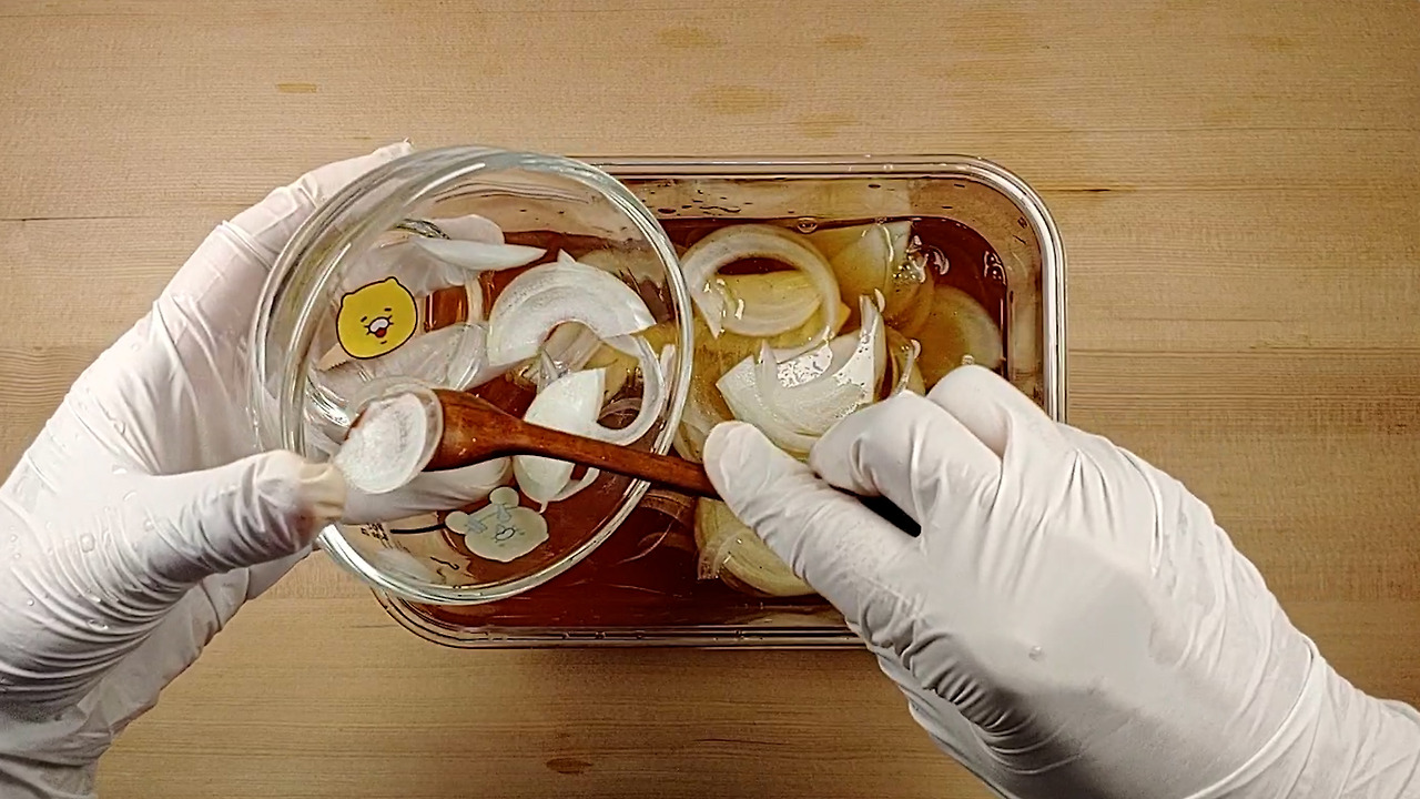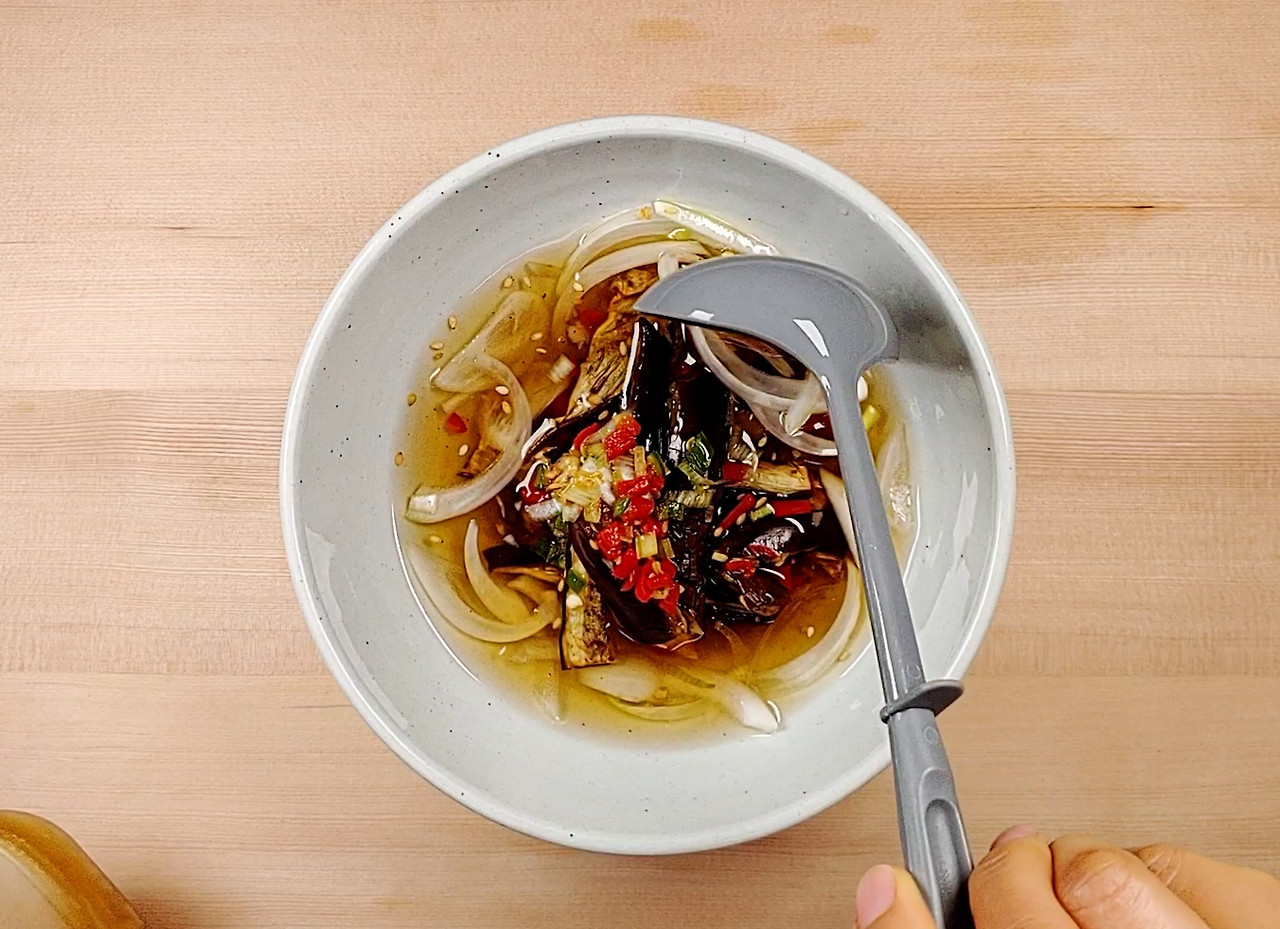 가지가 구워지는 동안 국물을 만들어주세요. 국간장, 식초, 레몬청으로 간한 다음 얇게 채썰은 양파, 간마늘을 넣고 잘 저어줍니다.