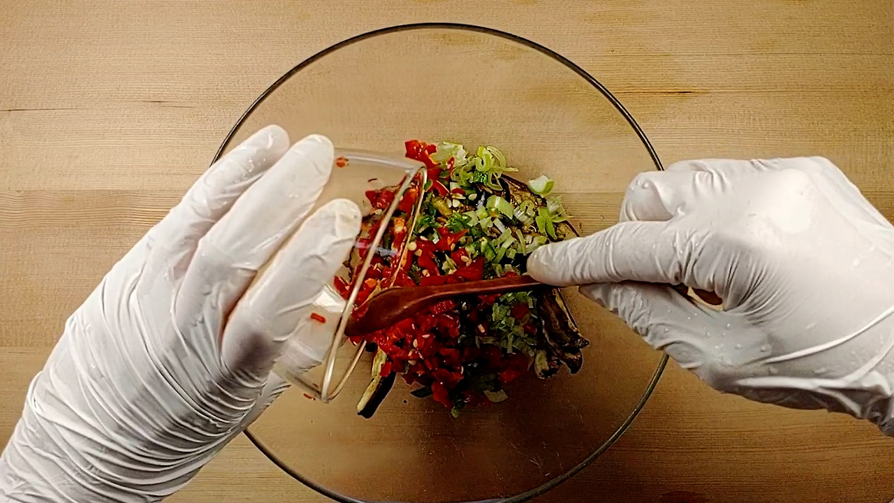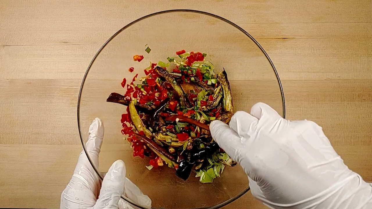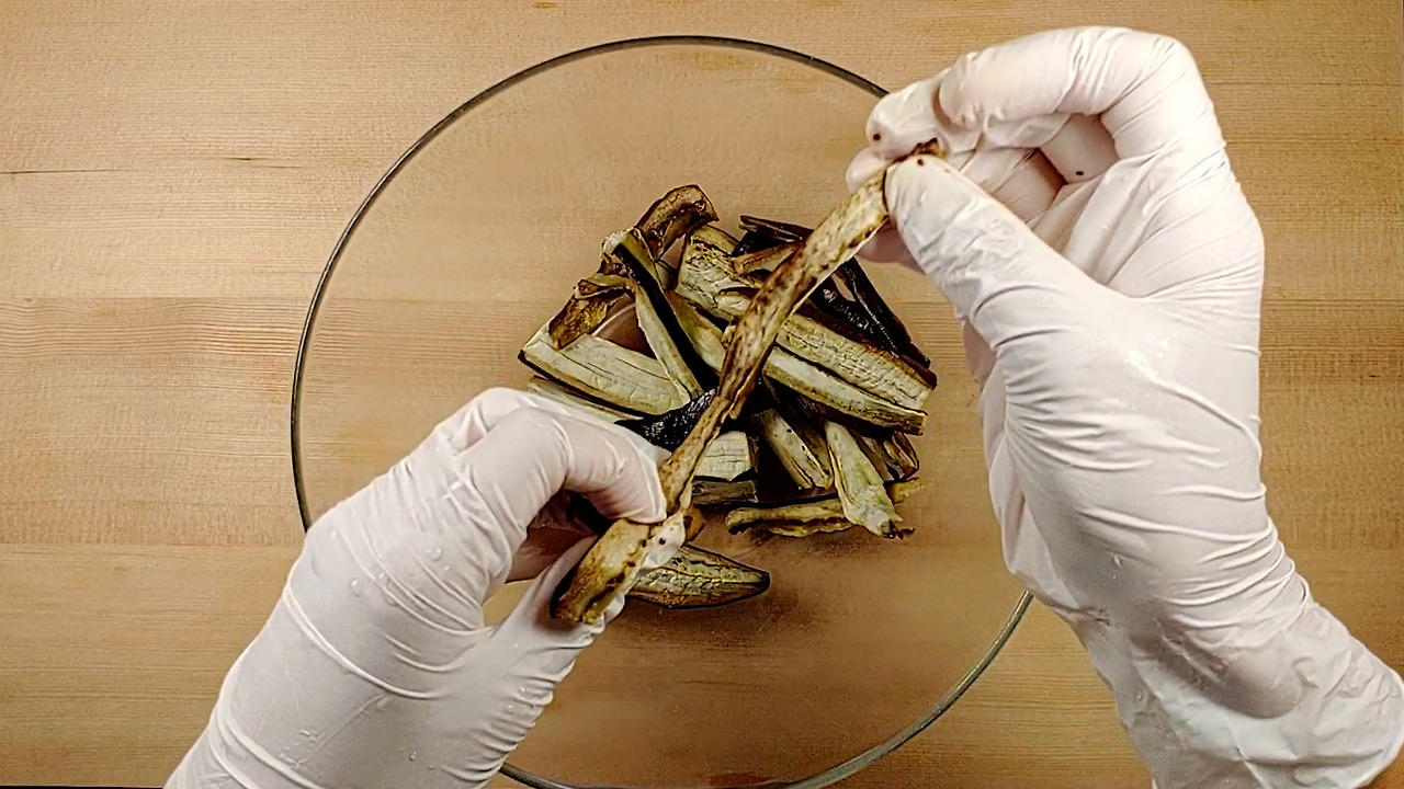 잘 구워진 가지는 굵고 두툼한 부분이 있다면 손으로 잘게 찢어주세요. 잘 익은 가지는 고기처럼 쭉쭉 잘 찢어진답니다. 식감도 쫄깃쫄깃 고기식감이 나요!