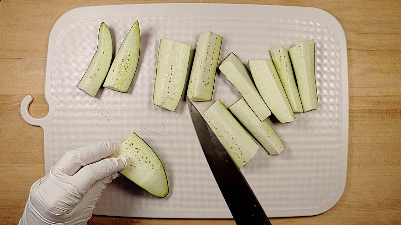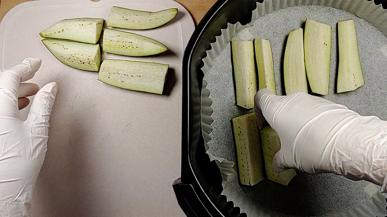 가지는 먹기 좋게 잘라서 에어프라이어에 겹치지 않게 넣어주세요. 수분이 빠지지 않도록 껍질을 아래로 향하게 놓아줍니다.