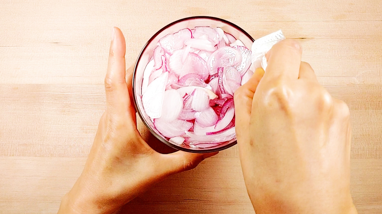 볼에 담고 소금 4.5g (약 1작은술 정도), 식초 2큰술 넣어주세요. 소금 무게는 항상 양파의 1.5%, 식초는 양파150g당 1큰술씩 넣어주세요.