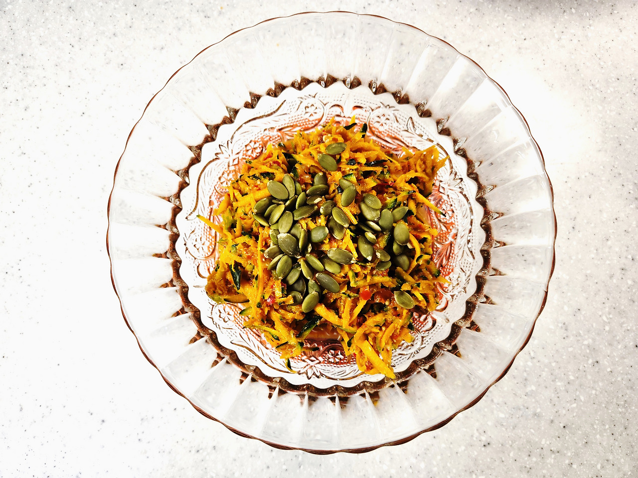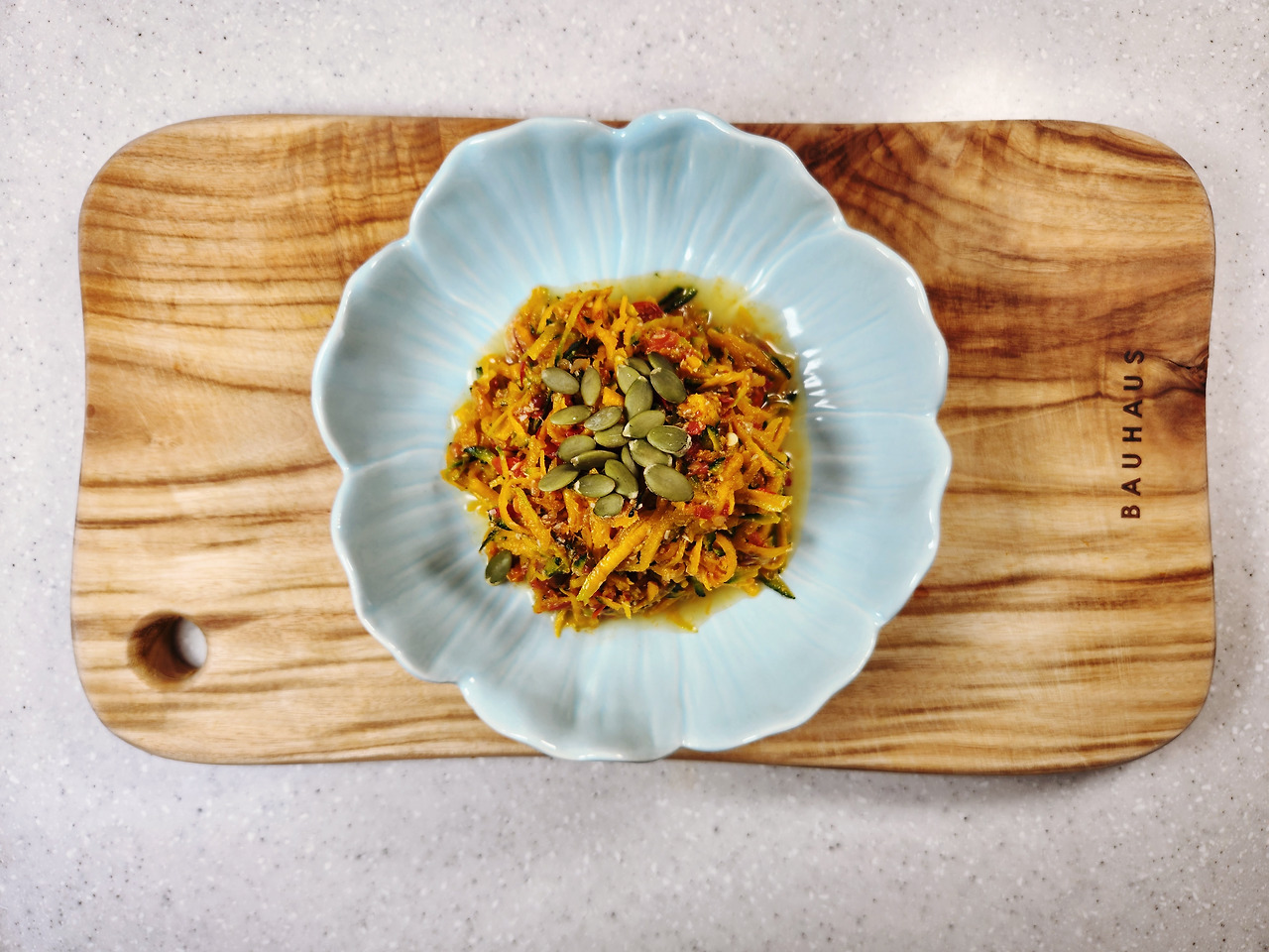*속을 파낼 땐 씹어 먹기 힘든 딱딱한 씨만 제거하세요. 여린 씨를 같이 먹으면 비타민E 섭취에 좋고, 부드러운 속 부분은 단호박 특유의 단맛과 시원한 맛이 납니다.