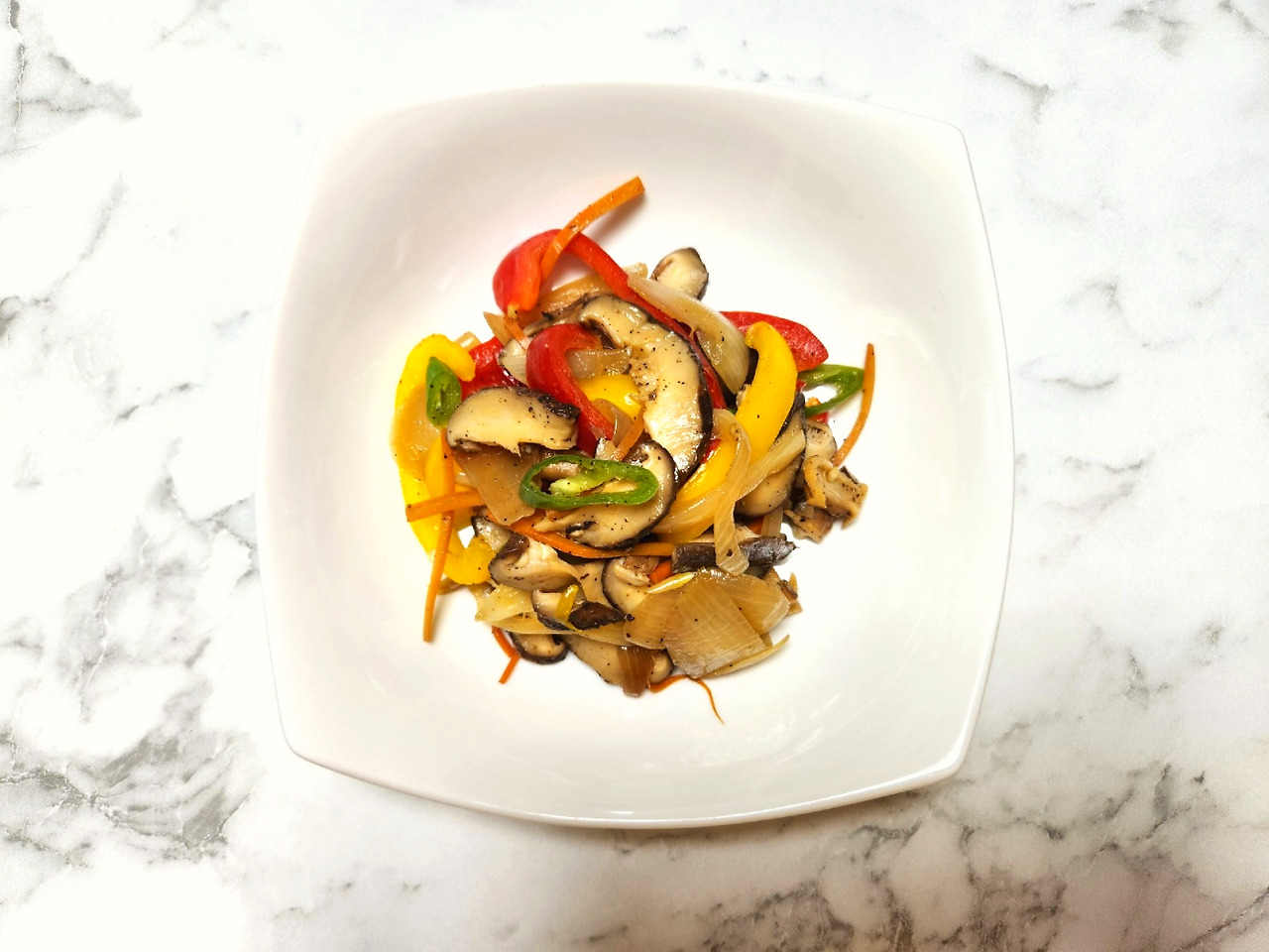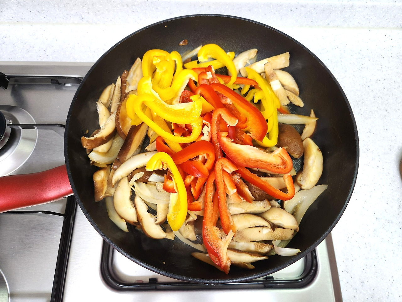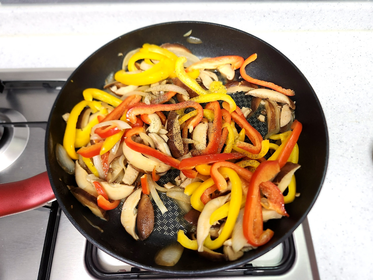 색을 예쁘게 하려고 당근, 청고추도 넣어 봤어요. 아삭한 식감의 파프리카와 탱글하고 향이 좋은 표고가 정말 잘 어울려요. 얇게 채썰어서 볶아낸 양파에서 단맛이 엄청 나옵니다.
