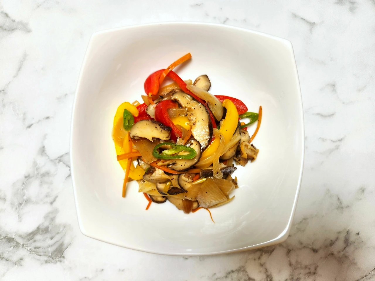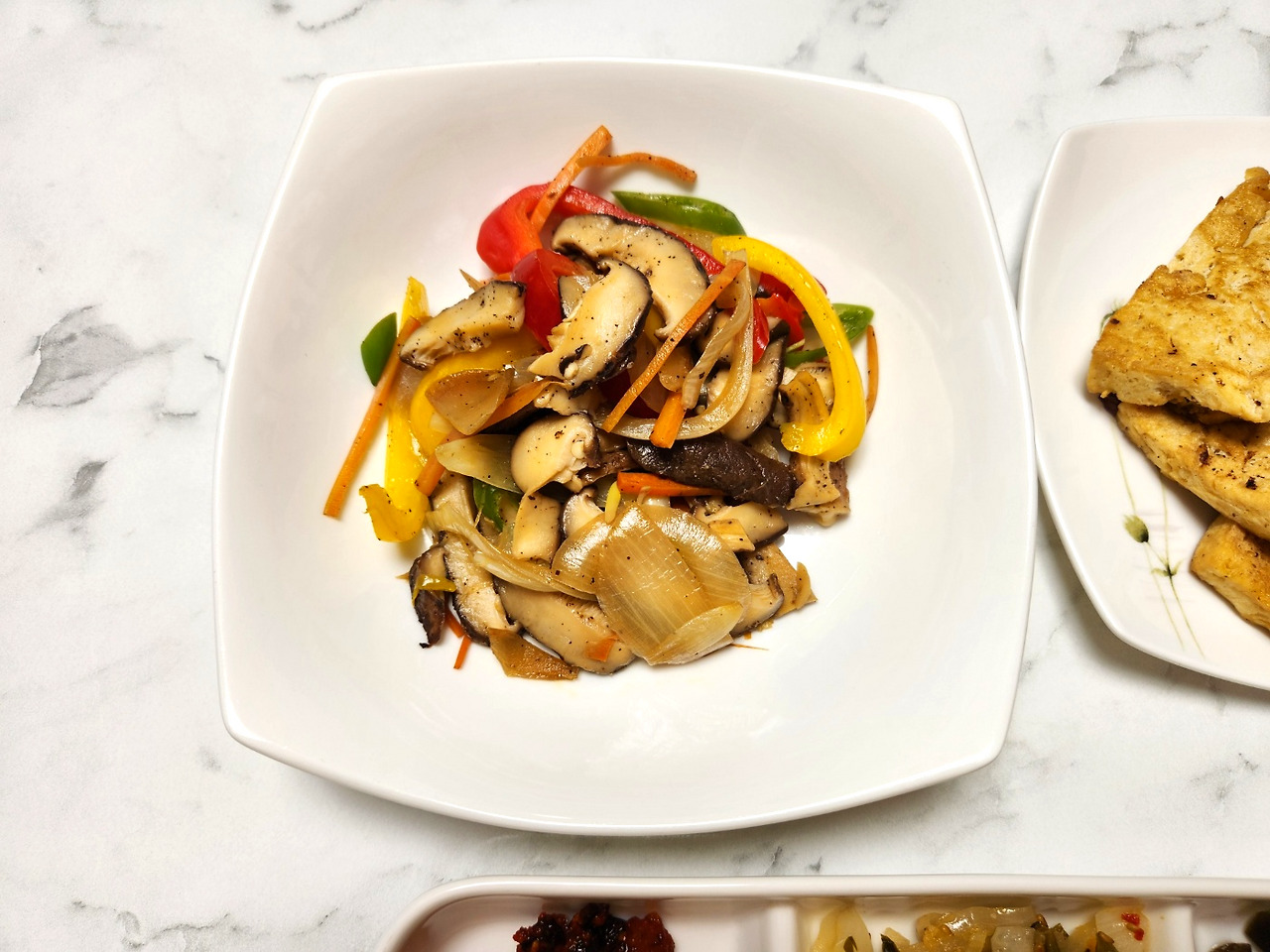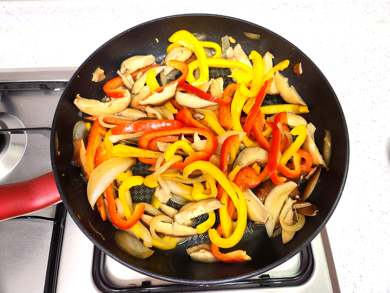 색을 예쁘게 하려고 당근, 청고추도 넣어 봤어요. 아삭한 식감의 파프리카와 탱글하고 향이 좋은 표고가 정말 잘 어울려요. 얇게 채썰어서 볶아낸 양파에서 단맛이 엄청 나옵니다.