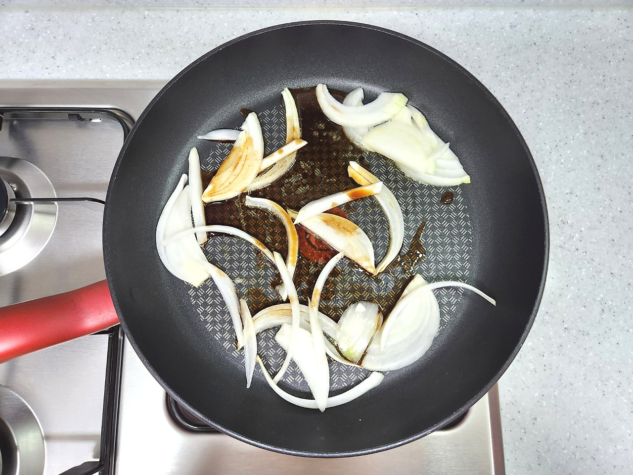 프라이팬에 들기름을 1/2큰술만 두르고 국간장, 양조간장을 30초 정도 볶다가 양파를 볶아주세요.