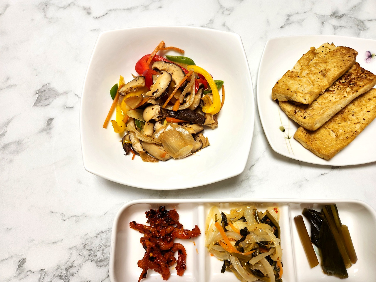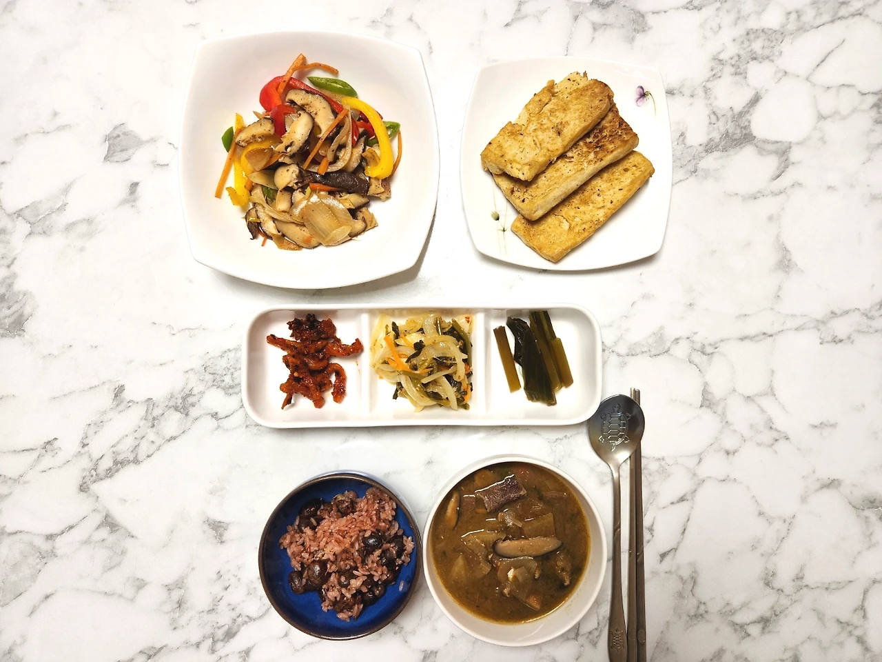 호랑이콩밥에 된장국, 두부부침과 같이 올렸어요.