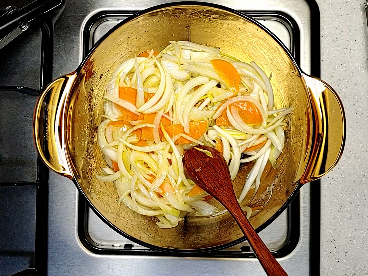 냄비에 들기름 1큰술을 두르고 당근을 먼저 볶은 다음 당근이 약간 투명해지면 양파를 넣고 볶아줍니다.