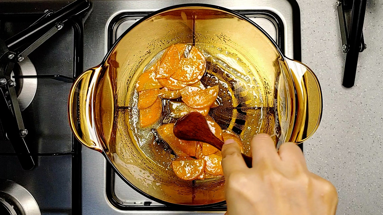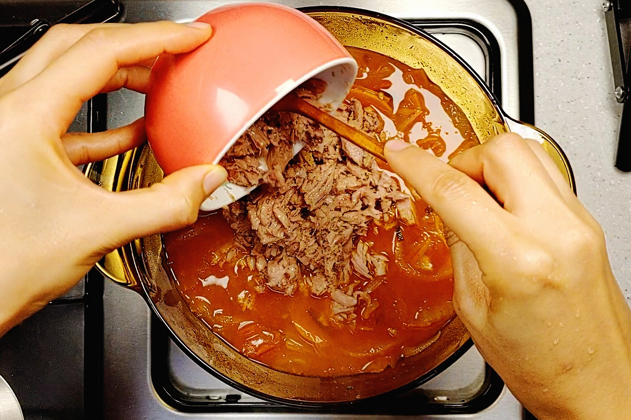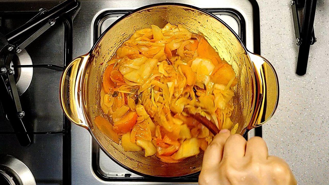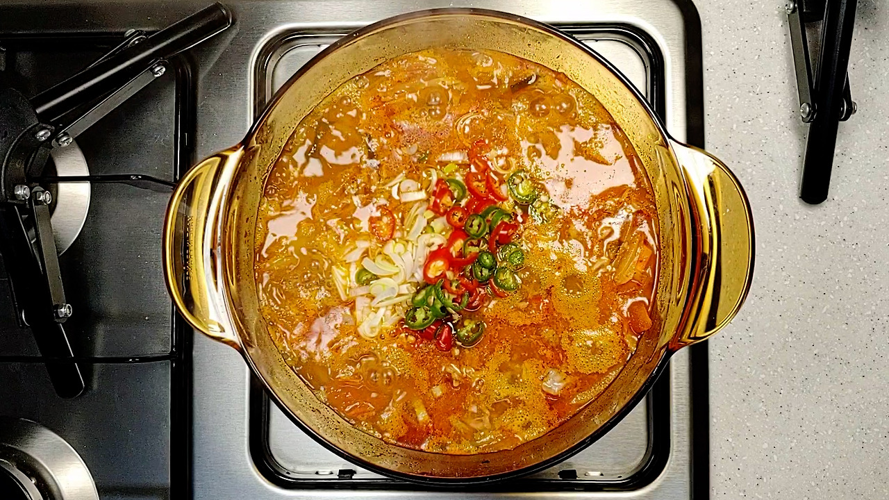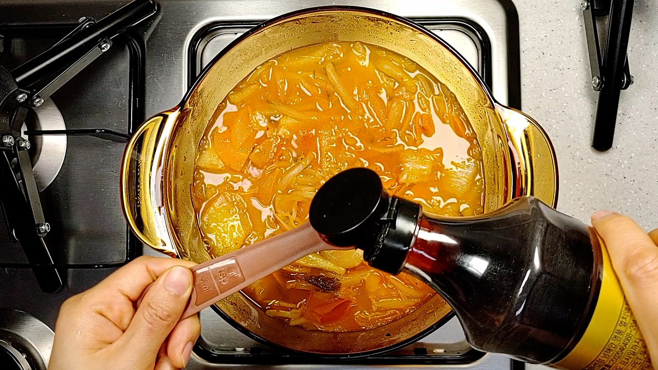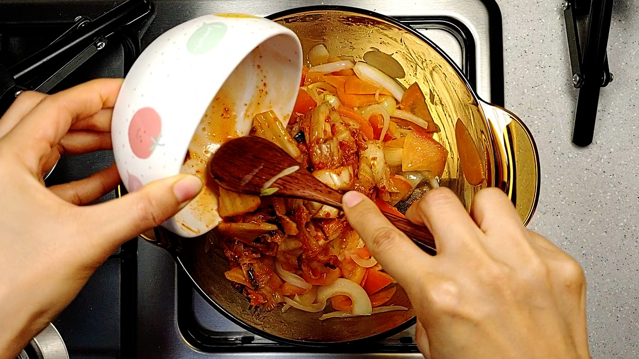 오렌지색으로 김치가 잘 익으면 물을 넣고 푹 끓여주세요.