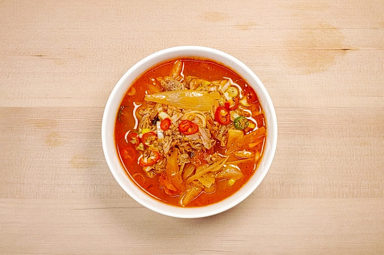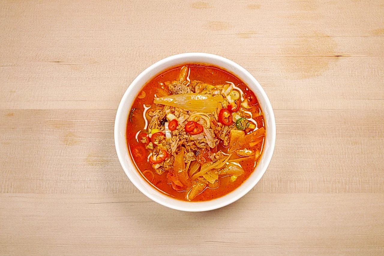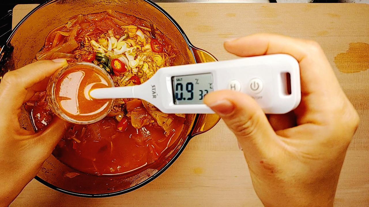 보통 김치찌개는 1.2% 이상의 고염음식이지만 염도를 낮추고 다양한 채소로 감칠맛을 채워주니 0.9%, 보통염도로 떨어졌어요. 얘기 안 하고 먹으면 평소 먹었던 김치찌개와 별다를 바 없거나 살짝 심심한 정도에요.
