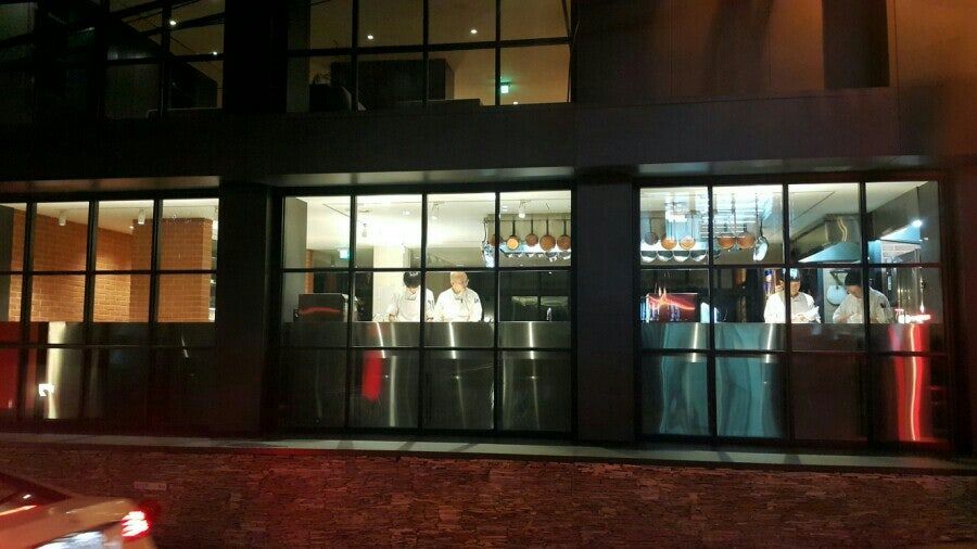 모수라는 작은 글씨 옆에 단아하지만 어딘지 심오한 꽃그림. 저 꽃이 뭘까? 호기심을 자극하면서도 매력적이었다. 그리고 옆으로 보이는 넓은 오픈 키친. 식당 내부에서 보이는 오픈키친은 많이 봤어도 이렇게 길밖으로 지나가는 사람들에게까지 자신만의 주방을 오픈 한다는 것은 쉬운 일이 아니다.