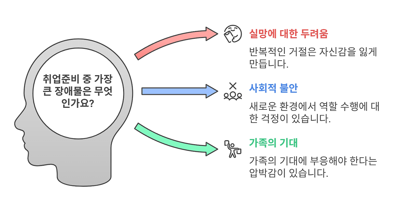 첫째, 취업실패에 대한 불안감입니다. 반복되는 탈락 경험이 두려움으로 이어져 자신감을 잃게 되죠.