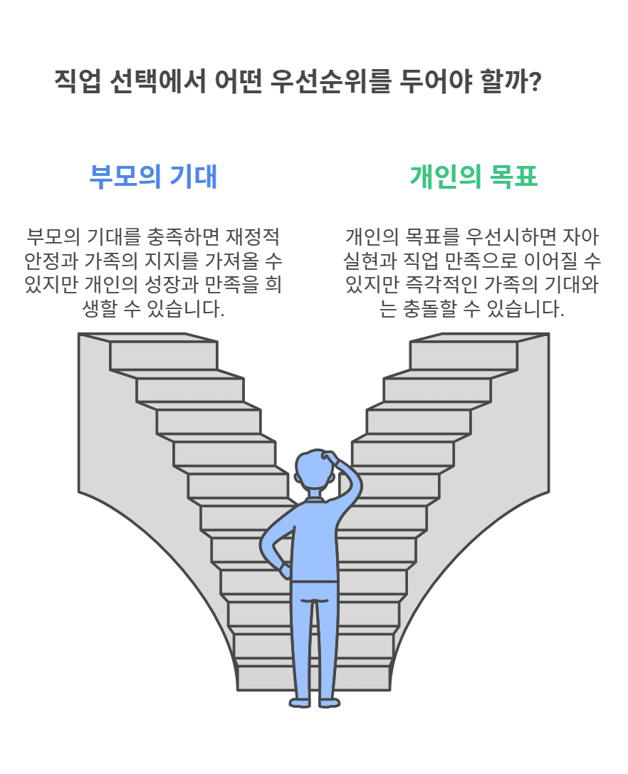 많은 취업준비생들이 ‘부모님께 기대에 부응해야 한다’는 부담을 느끼는데요. 특히 부모님의 경제적 기대가 커질수록 청년들은 더 높은 연봉을 원하거나, 본인이 원하는 직무보다는 ‘안정적인 직장’을 선택하려는 경향이 있습니다. 이로 인해 본인의 적성에 맞는 일을 찾기보다 부담감을 먼저 고려하게 되는 것이죠.