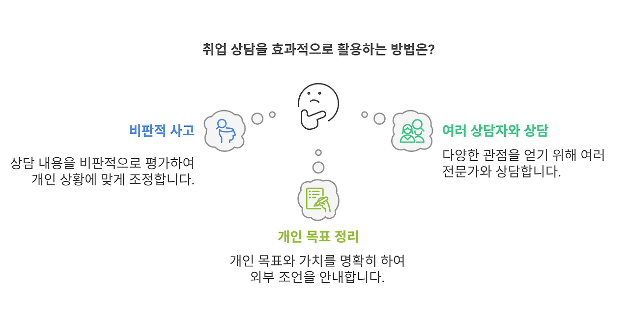 이를 극복하기 위해서는 취업준비생 스스로 상담 내용을 비판적으로 수용하는 자세가 필요합니다. 여러 명의 전문가와 상담을 진행하며 다양한 시각을 접하는 것도 한 가지 방법입니다. 또한, 본인의 목표와 가치를 분명히 정리한 후, 상담자의 의견을 참고하되 자신의 판단을 우선하는 것이 중요합니다.