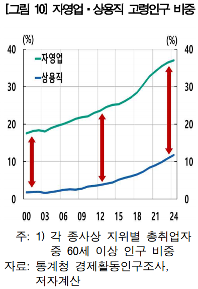 문제는 이들을 위한 상용 일자리가 부족하다는 점입니다. 그 결과 상당수가 생계유지를 위해 자영업으로 진입하고 있는데, 실제로 60세 이상 자영업자 수가 2015년 142만명에서 2024년 210만명으로 무려 68만명이나 증가했습니다. 전체 자영업자 중 60세 이상의 비중도 2024년 현재 37.1%까지 상승했습니다.