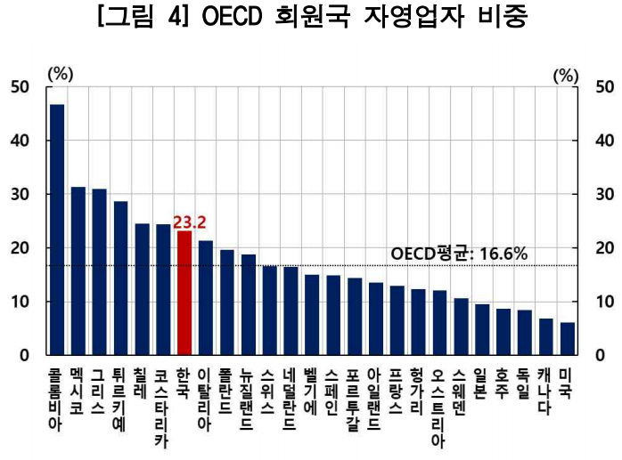 국제적으로 비교해봐도 우리나라 자영업자 비중은 OECD 회원국 중 7번째로 높습니다. 우리보다 자영업자 비중이 높은 6개국 중 멕시코를 제외한 5개국은 모두 우리보다 경제규모가 작다는 점에서, 선진국 수준에 비해 자영업 의존도가 과도하게 높다고 볼 수 있습니다.