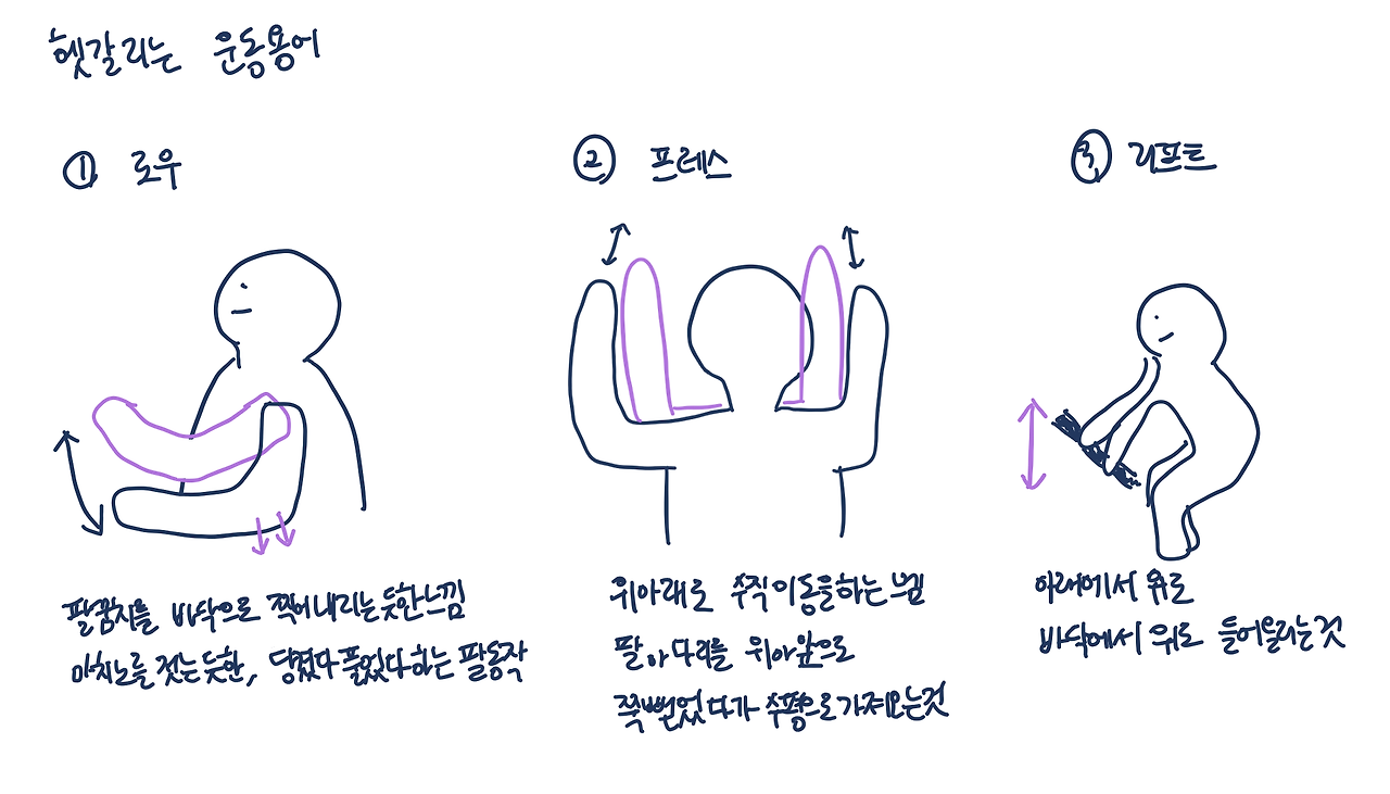 - 로우: 노를 젓는다는 용어에서 온 말. 등 운동을 할 때 주로 등장하는 단어인데, 팔꿈치를 바닥으로 밀어낸다는 느낌으로 팔을 가져와야 한다. 팔을 둥글게 당겼다 놓는 느낌. 주로 등에 자극을 준다.