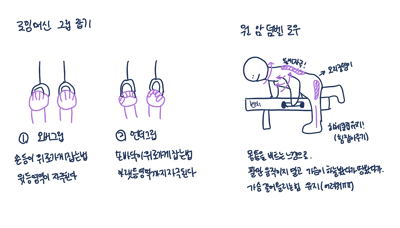 - 언더 그립: 손 등이 아래로 가게 잡는다. 아랫 등 영역까지 자극할 수 있다.