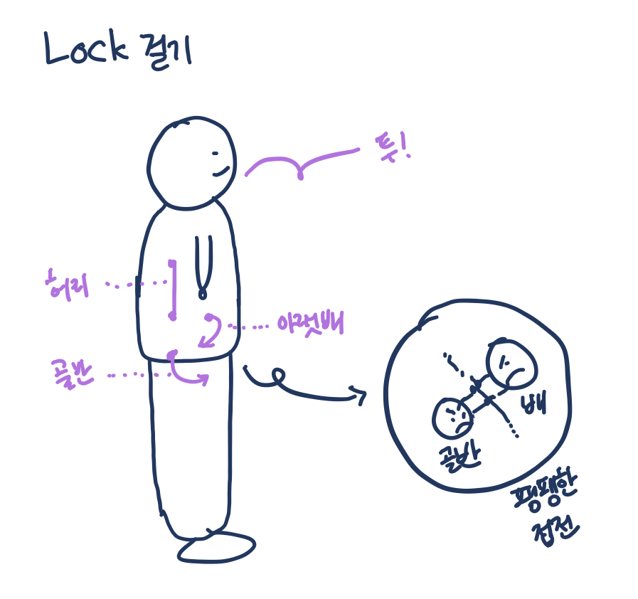PT쌤은 배나 어깨가 딸려가지 않는 상태를 "롹"을 건다고 표현한다. locked, 헤드롹으로 상대방이 움직이지 못하게 제압하는 것처럼 배와 어깨를 자물쇠 걸듯 꽉 잠가서 움직이지 않게 한다는 뜻이다.