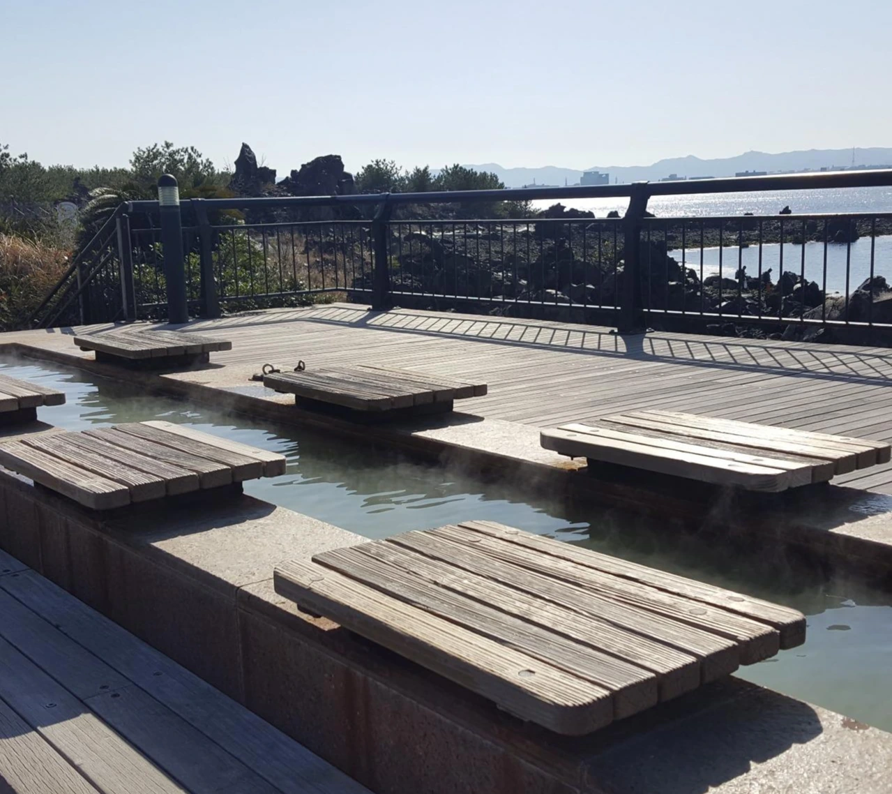 용암해안 공원에는 족욕탕이 여러 군데 설치되어 있는데, 사방이 뻥 뚫린 야외에서 신선놀음을 즐길 수 있다. 나는 바다를 바로 접하고 있는 전망 좋은 곳에 앉았는데, 눈 앞엔 파란 바다가 펼쳐져있고 등 뒤엔 사쿠라지마가 든든하게 받쳐주는, 감히 배산임수의 정기를 한 몸에 받을 수 있는 자리였다. 주섬주섬 양말을 벗고 탕 속에 두 다리를 풍덩- 하려고 했으나 물이 생각보다 뜨거웠던 건 함정. 가만히 앉아 바닷바람을 느끼고 있자니, 세상만사 복잡할게 뭐 있을까(!) 긍정 게이지가 무한으로 치솟았다. 악몽 따위 더 이상 내겐 없어-