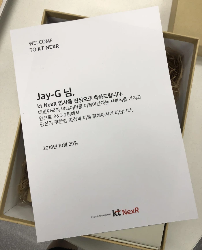 2018년 3월, kt NexR의 인턴으로 첫 출근했을 때 기대했던 것이 있다. 바로 웰컴 키트이다. 그러나 내가 받은 것은 다이어리와 달력뿐이었다. 물론 무척 실용적이긴 하지만 요즘 젊은 감성의 IT 회사들의 다양한 웰컴 키트를 보니 비교되긴 했다.