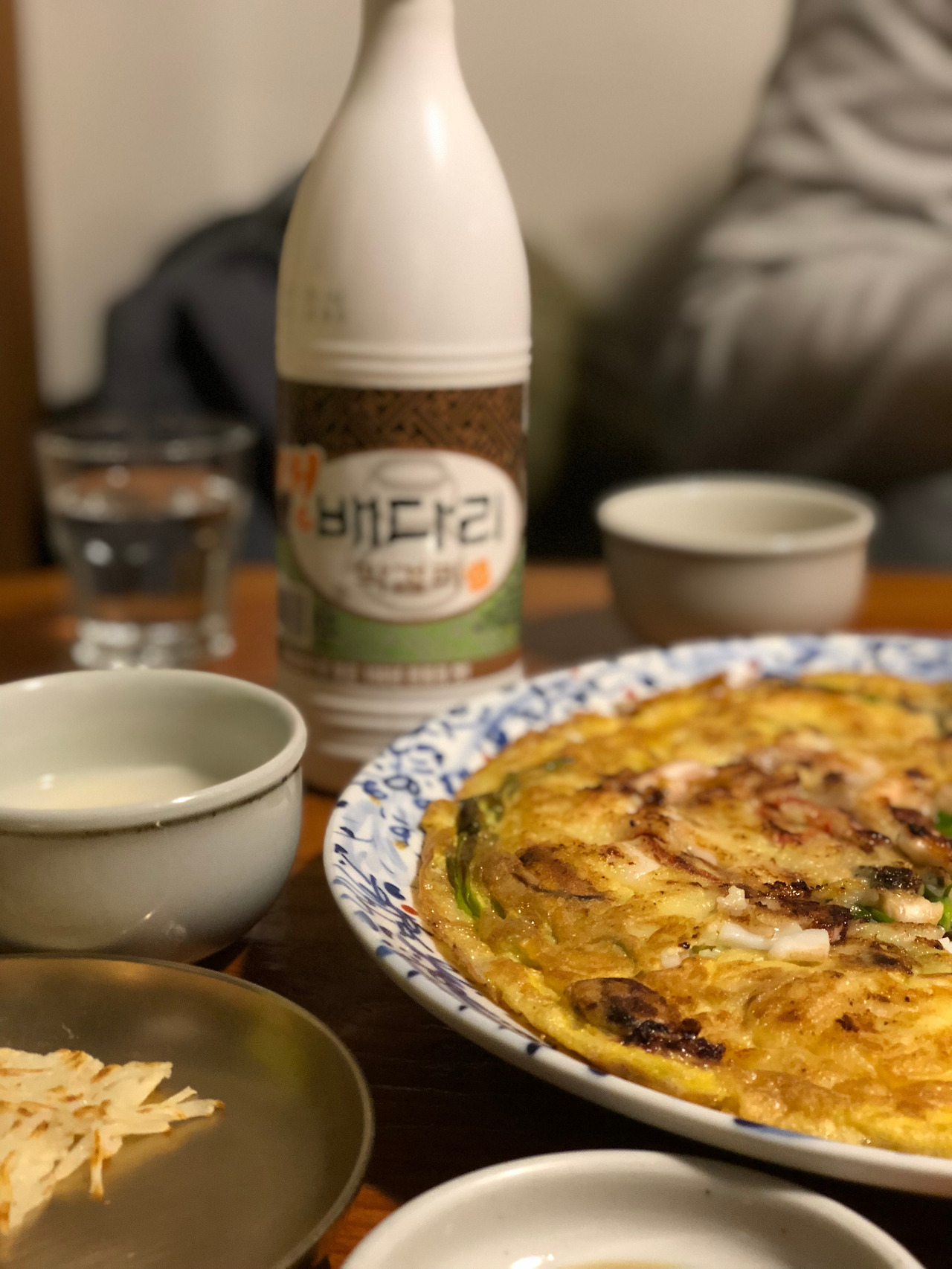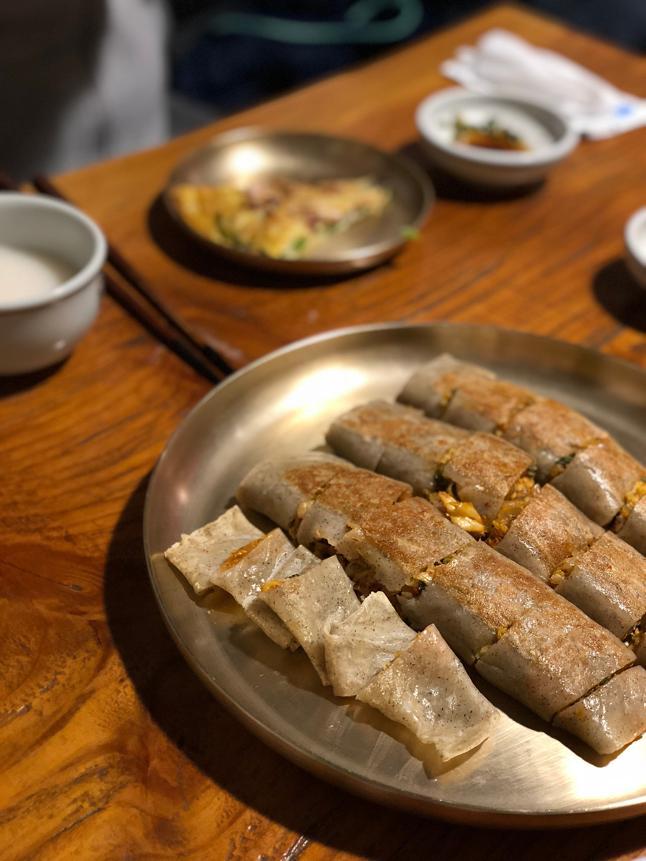 우리는 감자전과 해물파전 그리고 각자 마시고 싶은 막걸리를 시켰다. 여기는 특이한게 전이 피자처럼 잘려서 나온다. 훨씬 먹기가 편했고, 막걸리와 함께 먹으니 더욱더 맛있게 느껴졌다. 그리고 메밀전병도 함께 시켰는데 메밀의 쫄깃함과 속재료가 매콤해서 술과 곁들여 먹기 정말 좋았다.