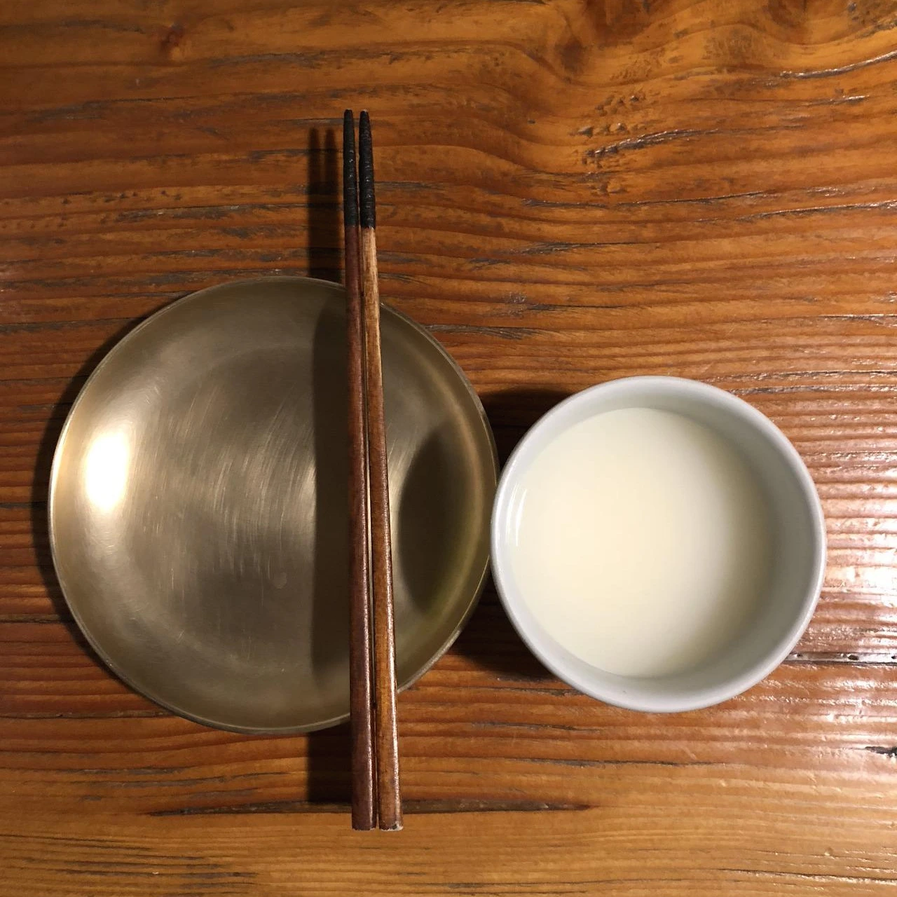 예약석을 안내 받아 자리에 앉으니 놋그릇으로 된 앞 접시와 나무 젓가락 그리고 막걸리잔이 정갈하게 놓여져 있었다.