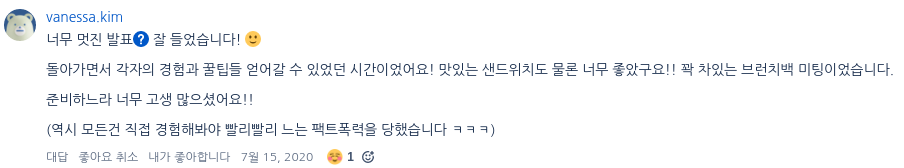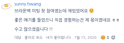 우리 20명이 넘는 R&D 센터 팀원들이 다 같이 얘기할 자리가 별로 없는데 매주 수요일 점심시간 '브라운백 미팅'을 통해 다양한 주제에 대해 자유롭게 이야기하고, 친해질 수 있어 계기가 되는 것 같다. R&D 센터의 문화에만 그치지 않고, 전사 문화로 자리 잡아 나가면 팀 간 교류도 많아지고, 새로운 자극이 되어 실력이 향상될 수 있지 않을까 생각한다.