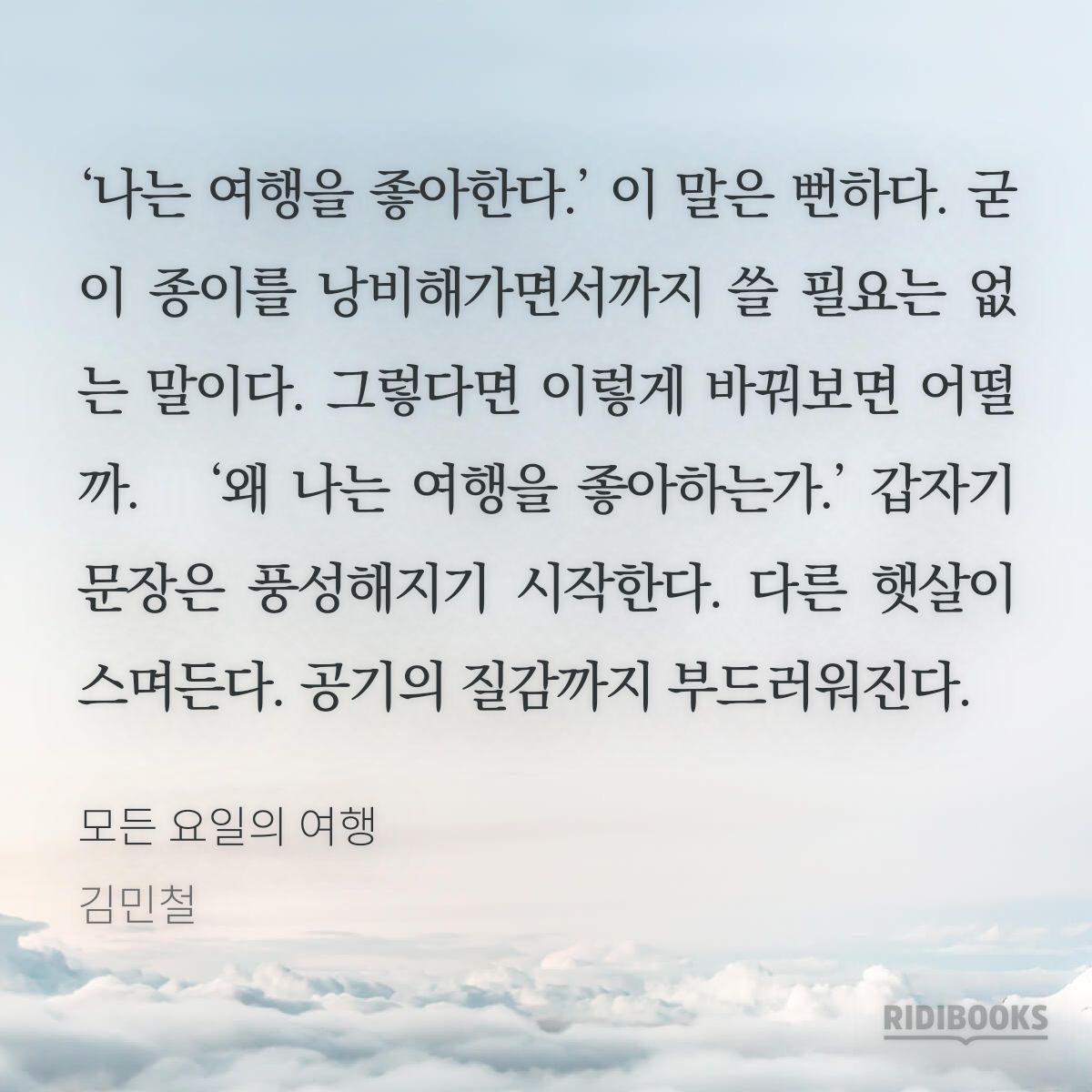 여행을 좋아한다. 나 역시 그렇다. 여행을 싫어하는 사람이 어디 있을까. 모두가 여행을 간다. 그래서 여행은 뻔하다. 모두가 무언가를 좋아한다. 그래서 좋아한다는 말도 뻔하다. 모두가 여행을 좋아한다. 그래서 '여행을 좋아한다'는 문장은 뻔하다.