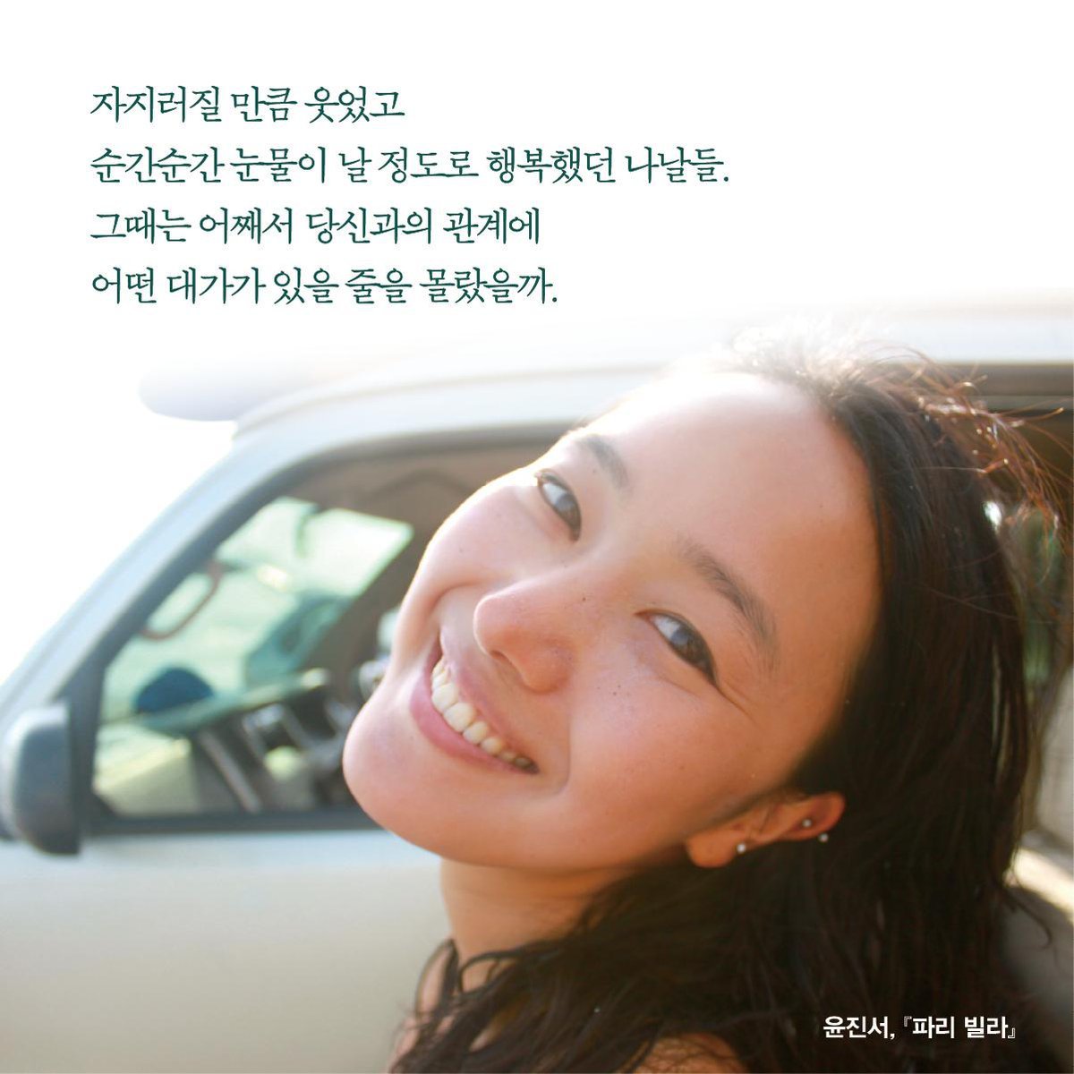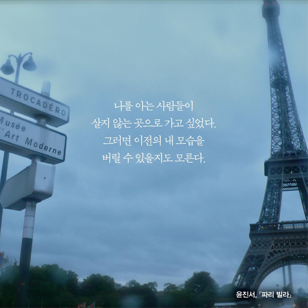 - 아무도 너를 모르는 파리빌라는 어때? 많이 울었어? 나는 몇 가지만 뺀다면 그때의 내가 원하는 사람이 되어있는 것 같아. 다만 여전히 마음 있는 사람에게 상냥하지 못하고 그래서 오해가 여전히 있는 것 같아. 예전의 슬픈 일들은 여전히 슬프고, 거절은 여전히 두렵고, 몇 날 며칠을 어떤 말을 할까 고민하다가 여전히 연락도 잘 못해. 그럼 또 시간이 흐르고 오해도 깊어질 텐데. 파리 참 부질없다 그치. - 과거의 나에게 -