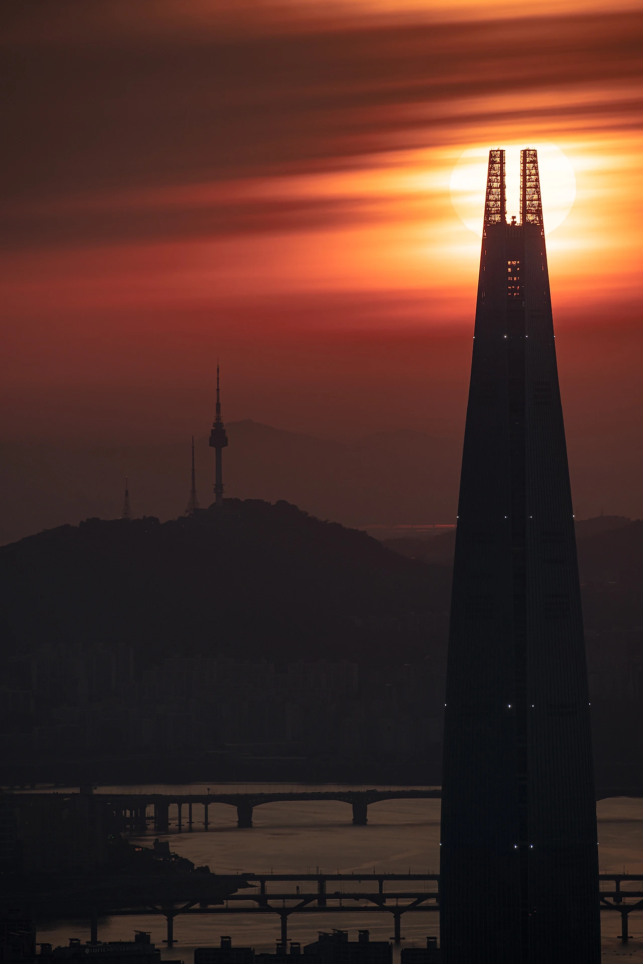 이 장면을 담고 싶어 사진을 촬영할 포인트에서 롯데월드 타워 방향에 해가 걸치는 날짜와 시간을 미리 확인하고 그중에 시간이 되는 날을 선택해 찾아가서 담은 사진이다.